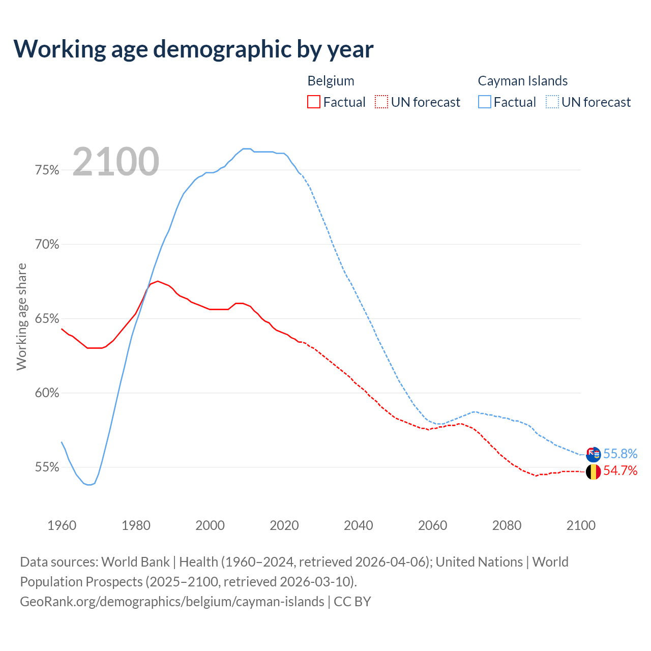 - Belgium has 7.55M working age adults (aged 15-64) vs 58.1K in the Cayman Islands.