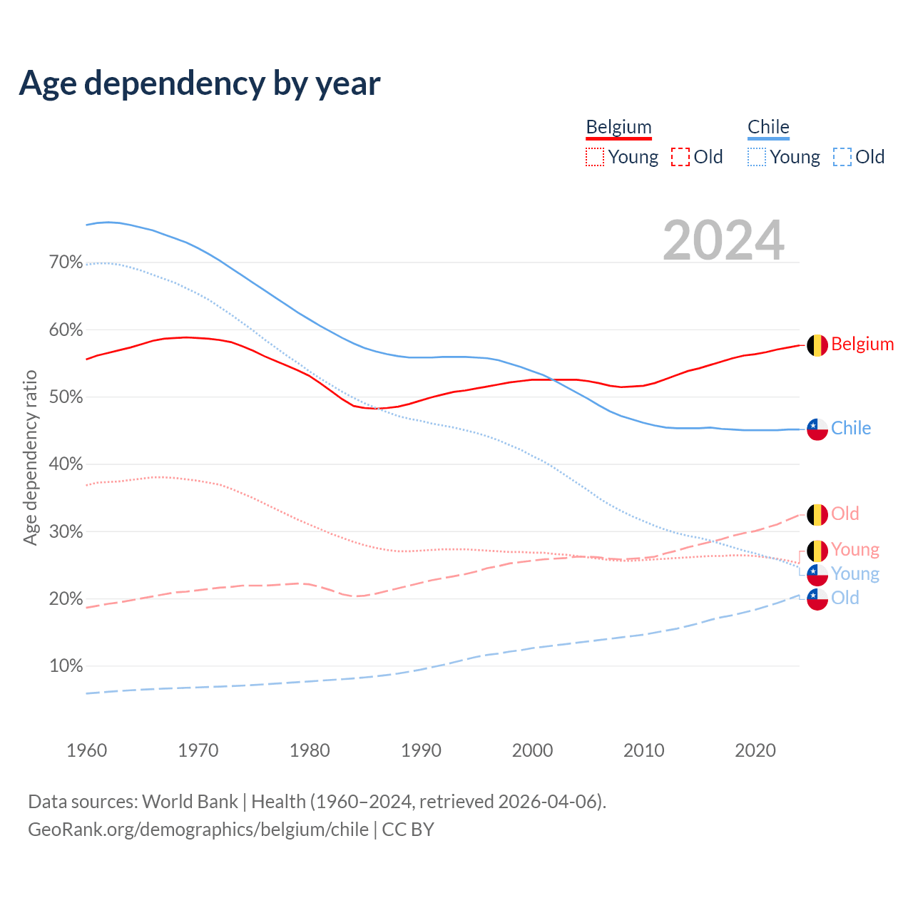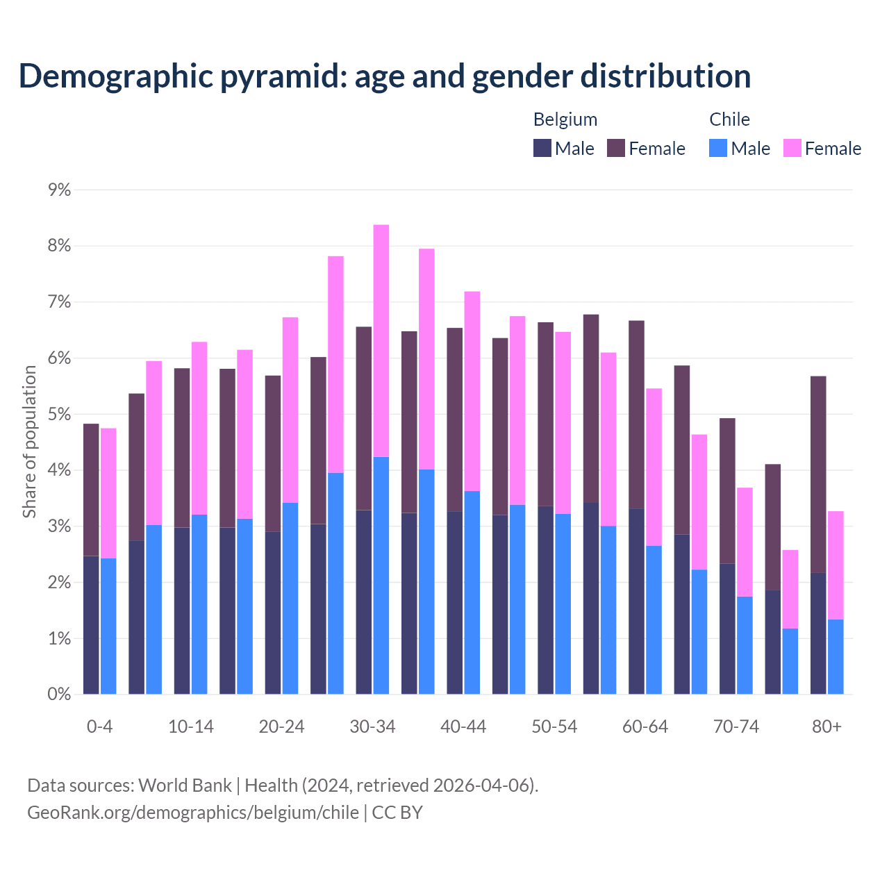 - The share of old-age demographic (65+) in Belgium is 20.6% vs 14.1% in Chile.