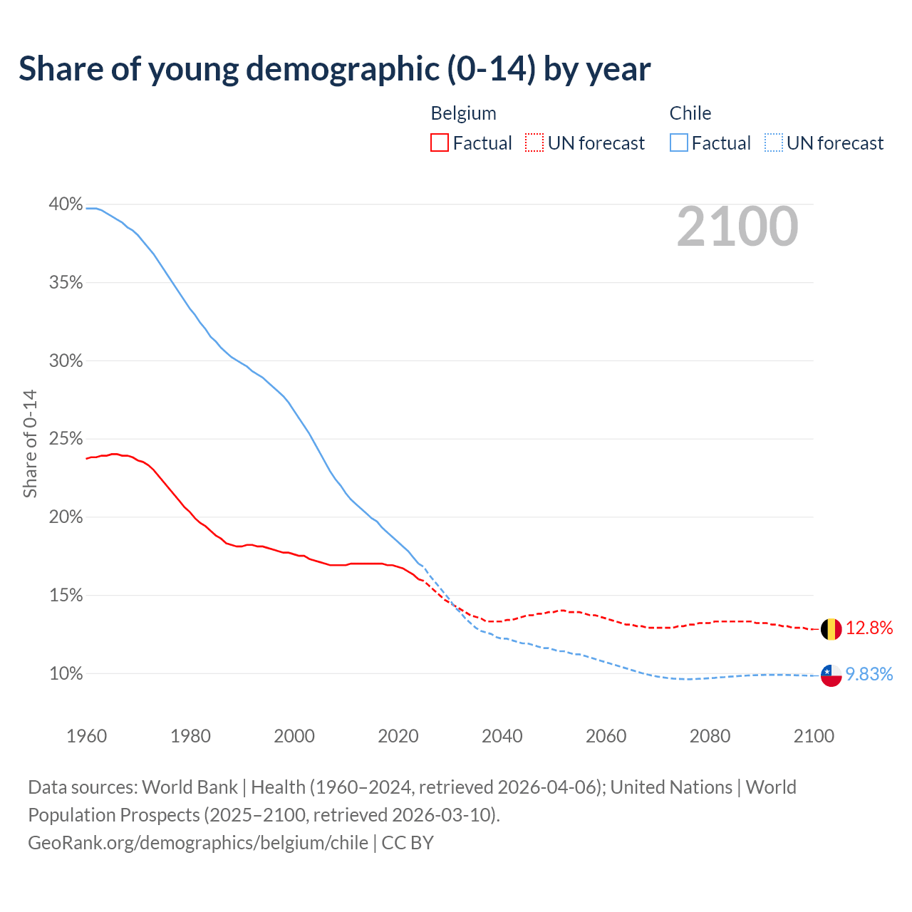 - The share of young demographic (0-15 years old) in Belgium is 16% vs 17% in Chile.