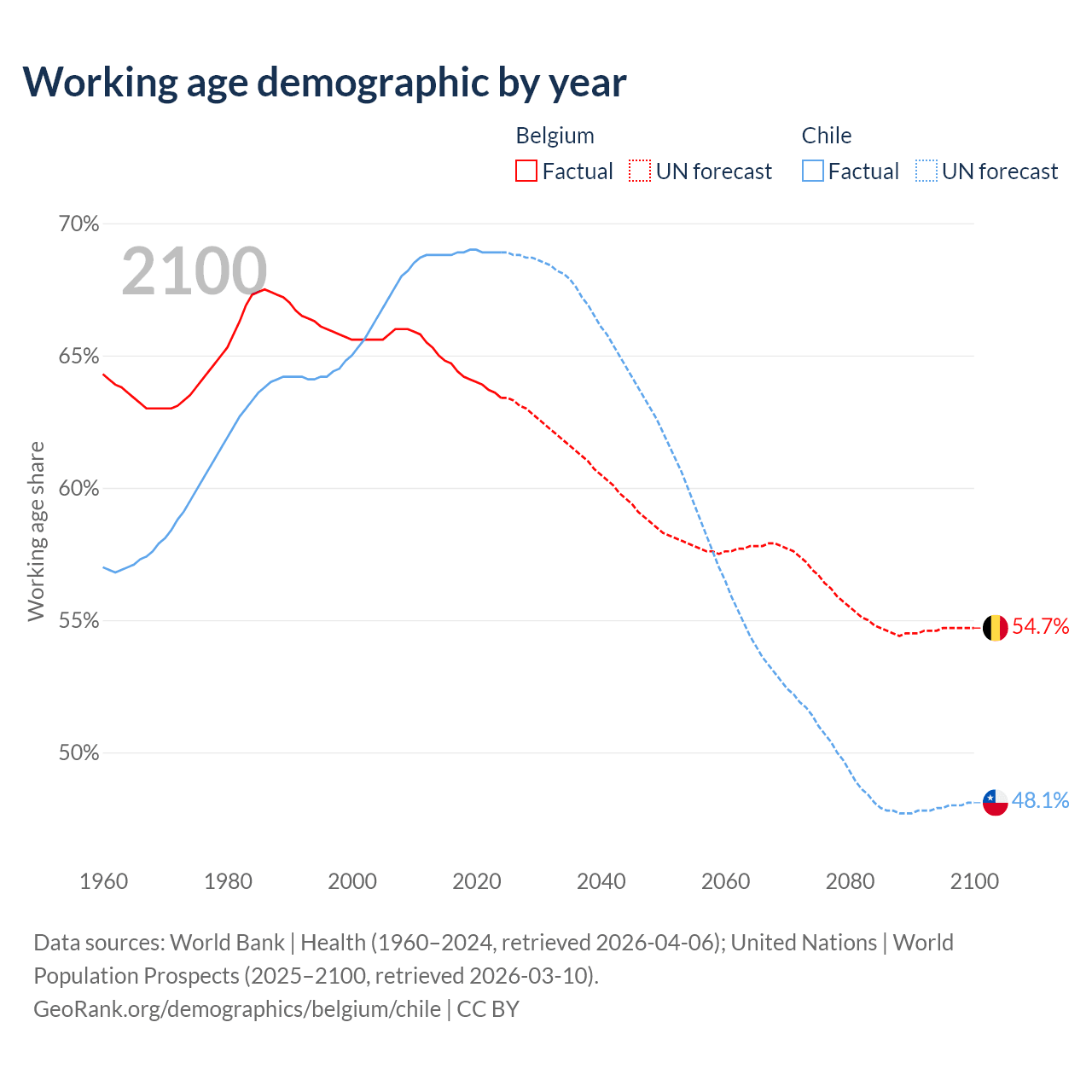Median age Belgium vs Chile, 1960-2100