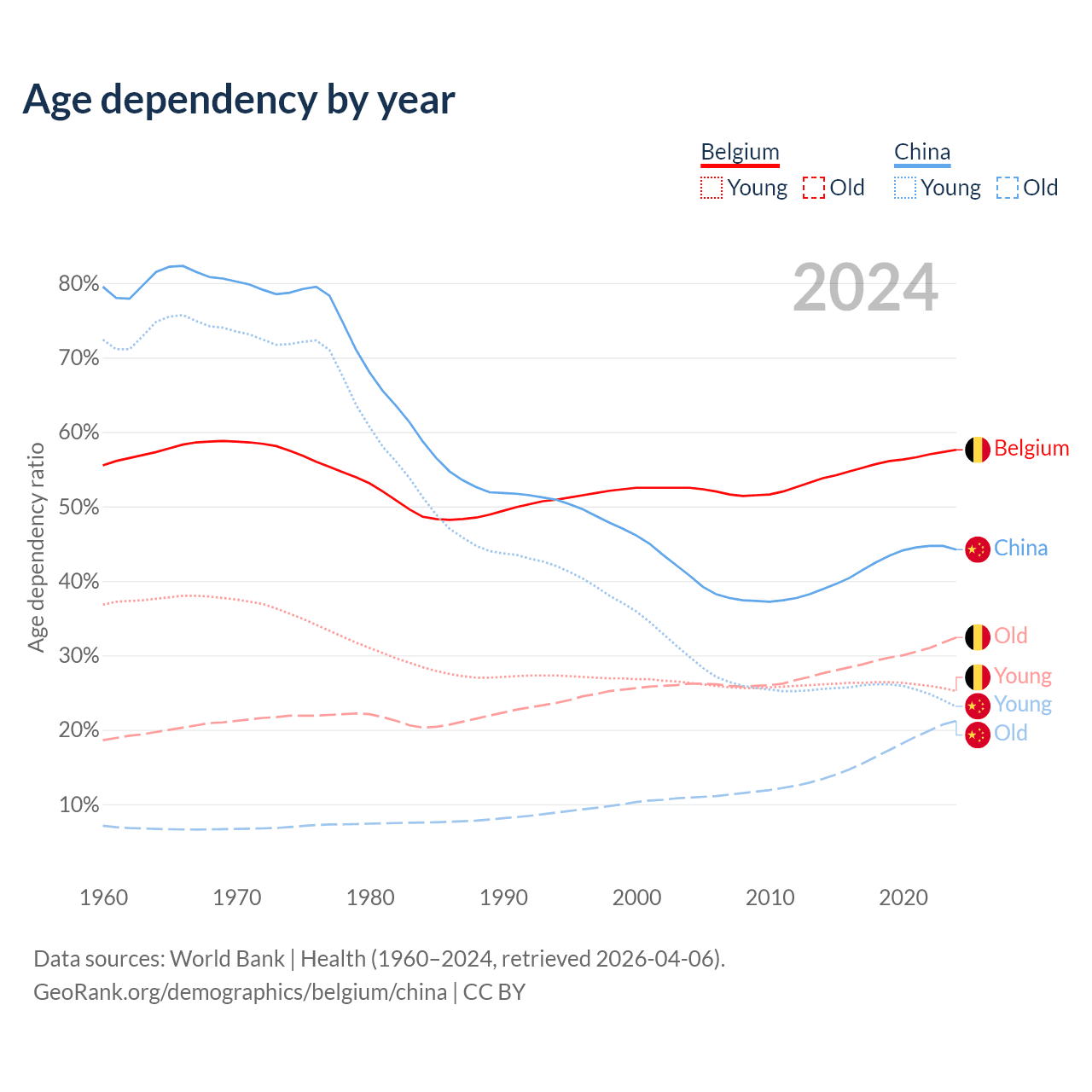 - Belgium is ranked 32/196 by median age (oldest to youngest) vs 44/196 for China.