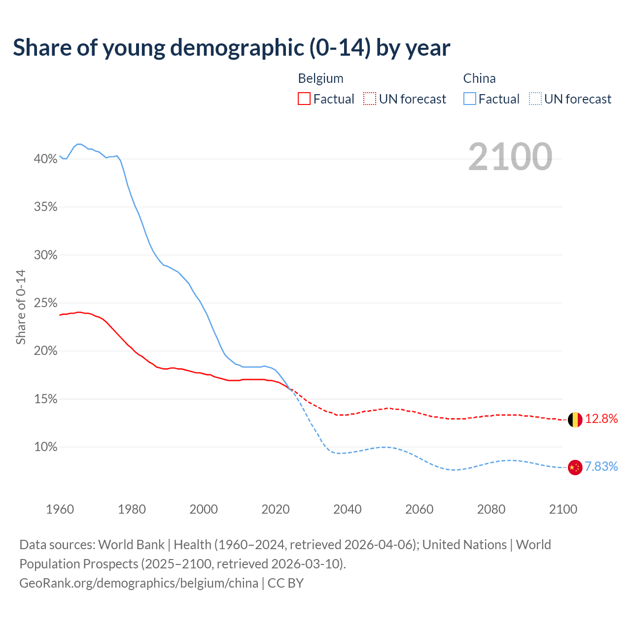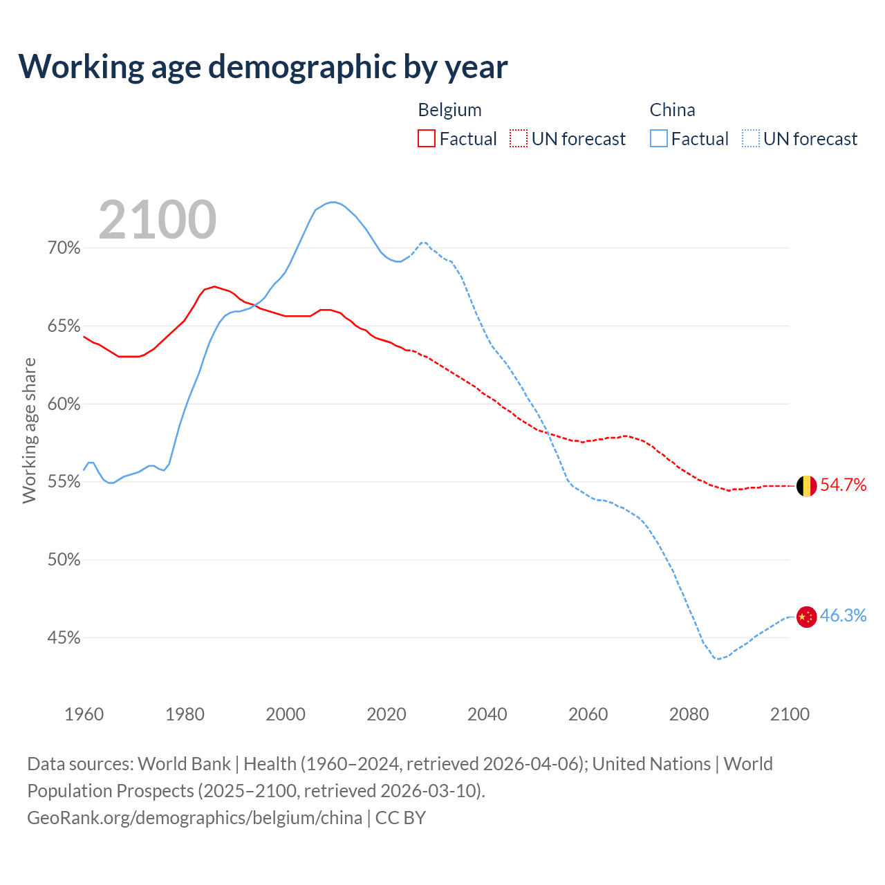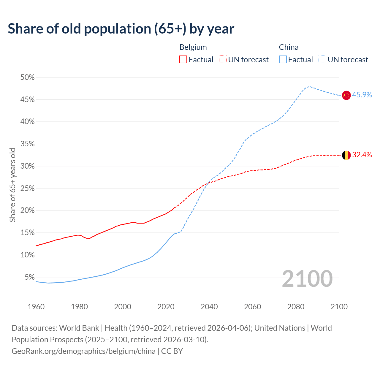 Median age Belgium vs China, 1960-2100