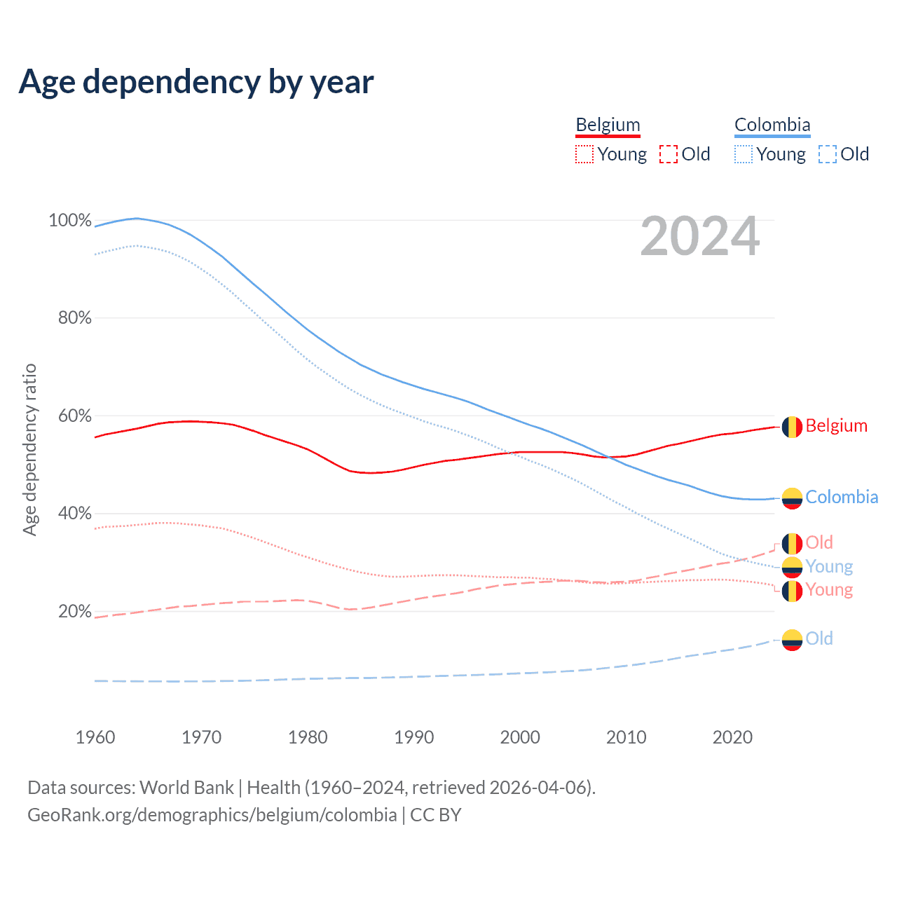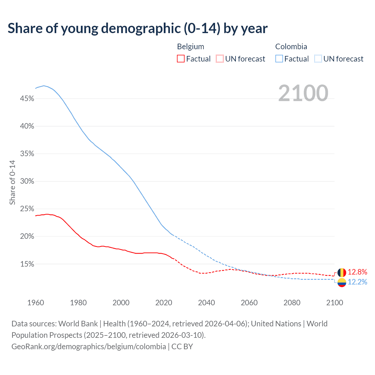 - The share of young demographic (0-15 years old) in Belgium is 16% vs 20.3% in Colombia.