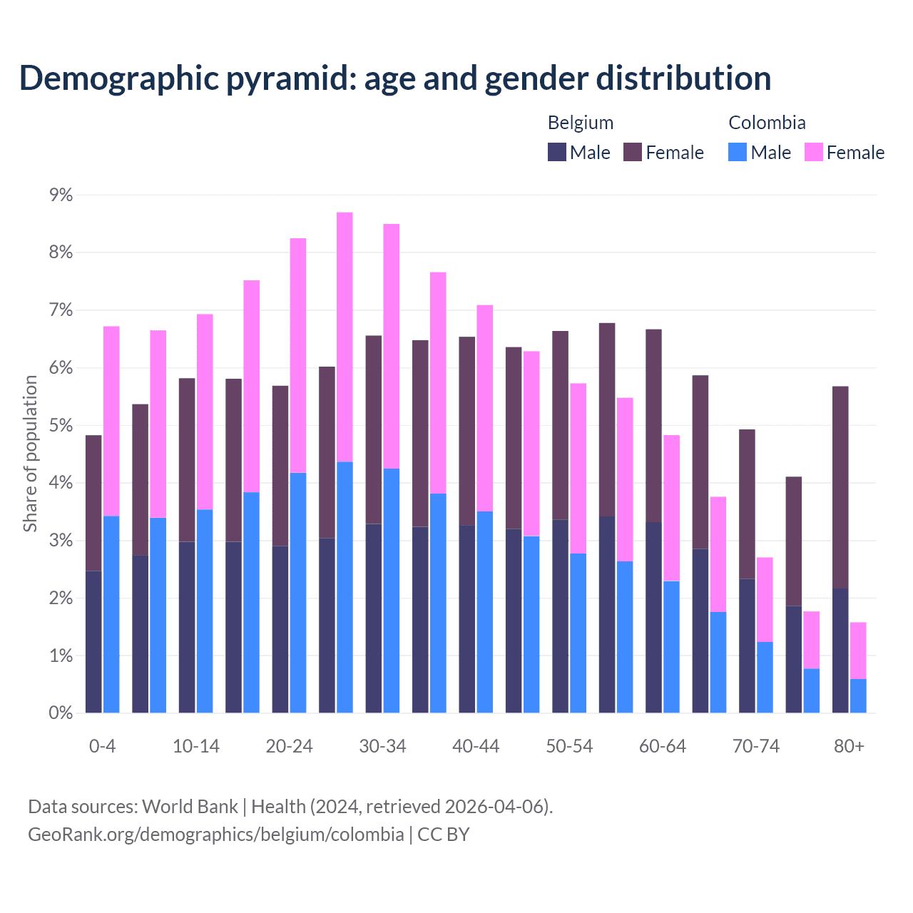 - The share of old-age demographic (65+) in Belgium is 20.6% vs 9.78% in Colombia.