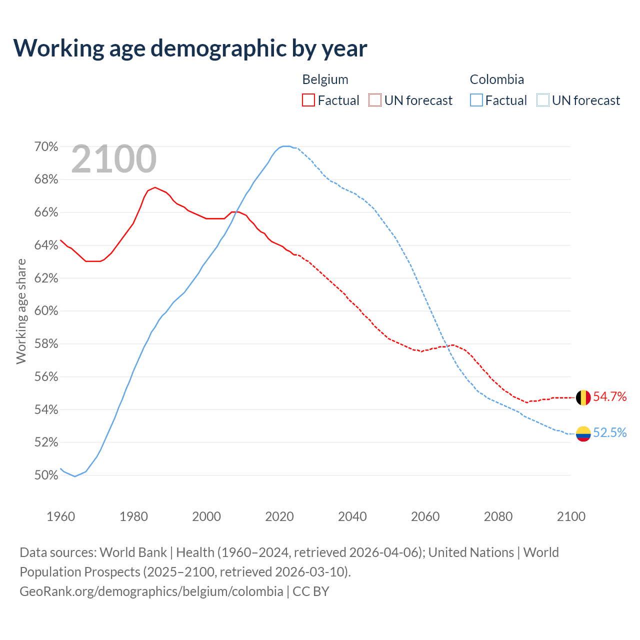 Median age Belgium vs Colombia, 1960-2100