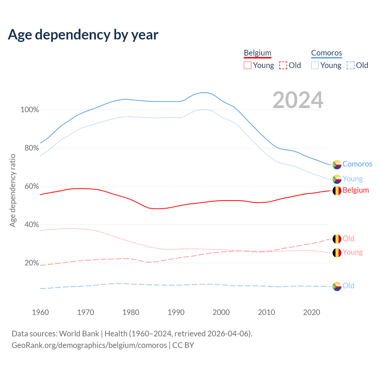 - Belgium is ranked 32/196 by median age (oldest to youngest) vs 152/196 for Comoros.