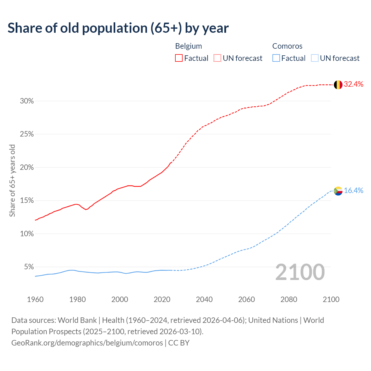 - The share of old-age demographic (65+) in Belgium is 20.6% vs 4.47% in Comoros.