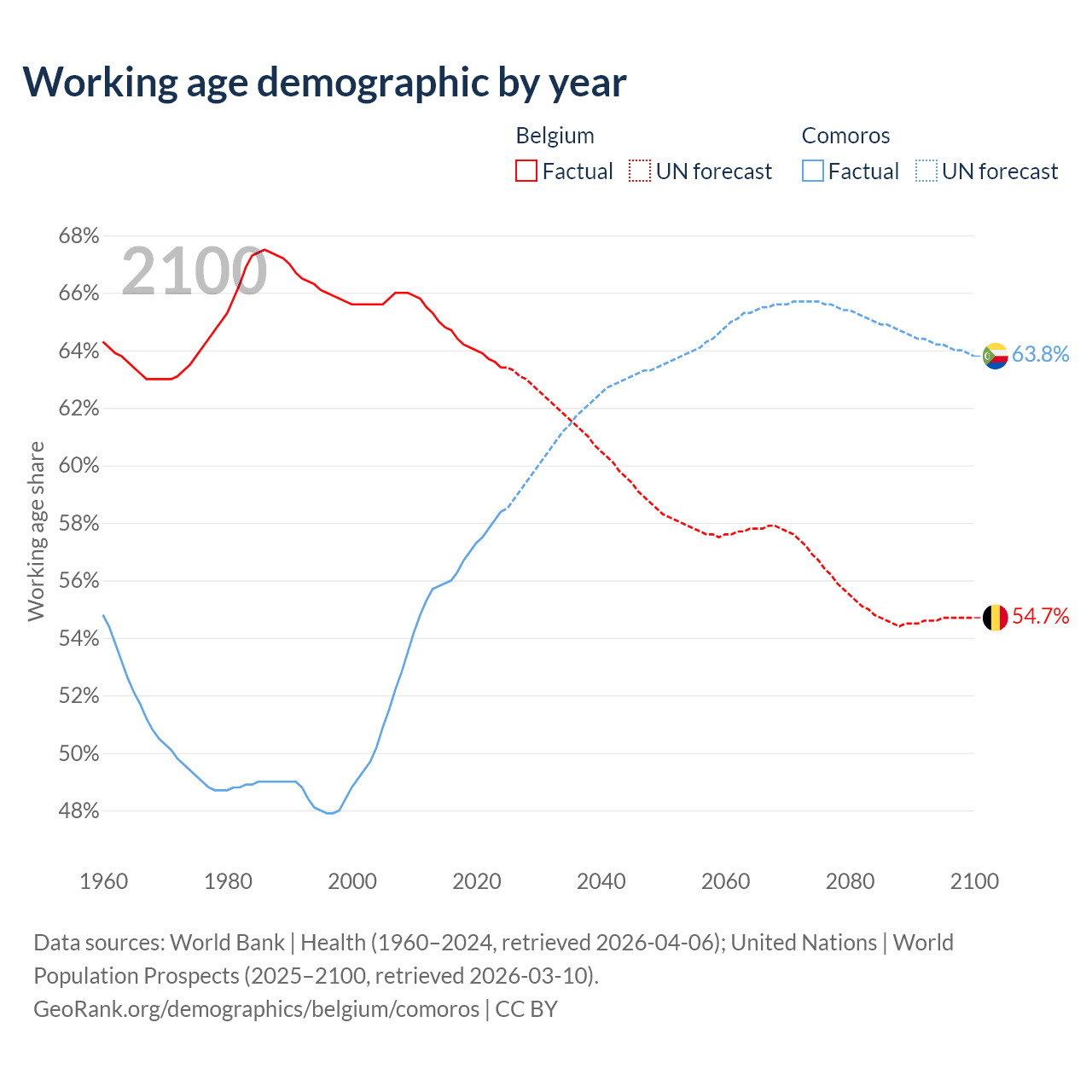 - Belgium has 7.55M working age adults (aged 15-64) vs 528K in Comoros.