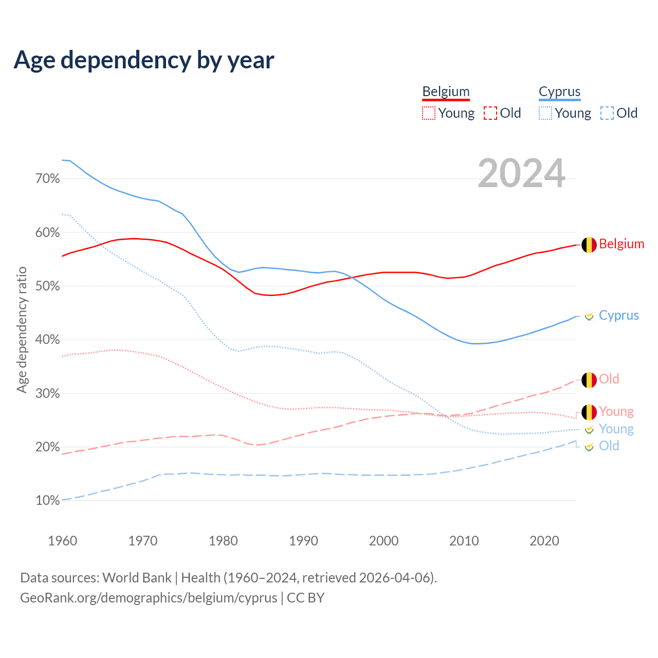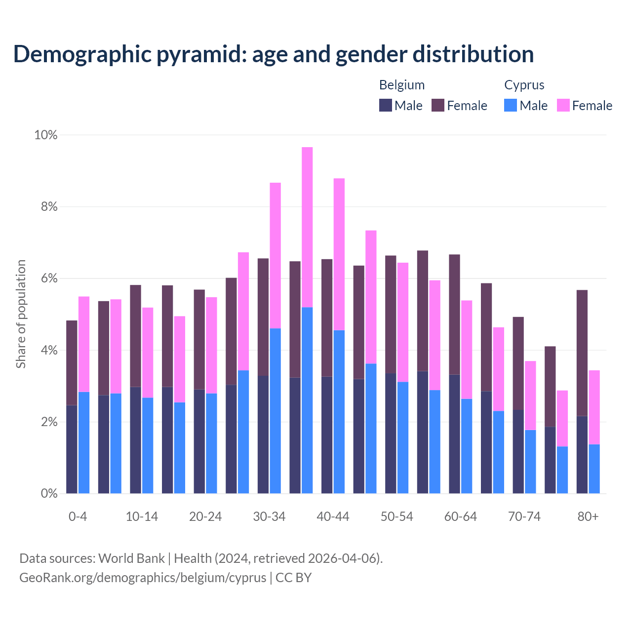- Belgium is ranked 32/196 by median age (oldest to youngest) vs 52/196 for Cyprus.