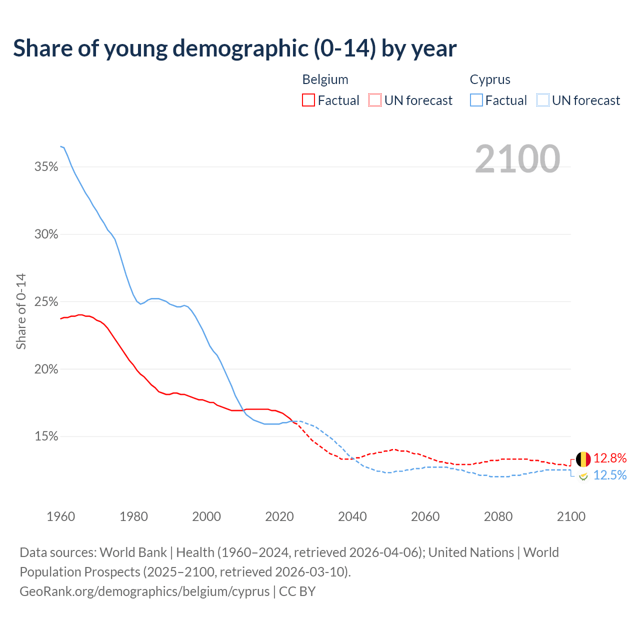 - The share of young demographic (0-15 years old) in Belgium is 16% vs 16.1% in Cyprus.