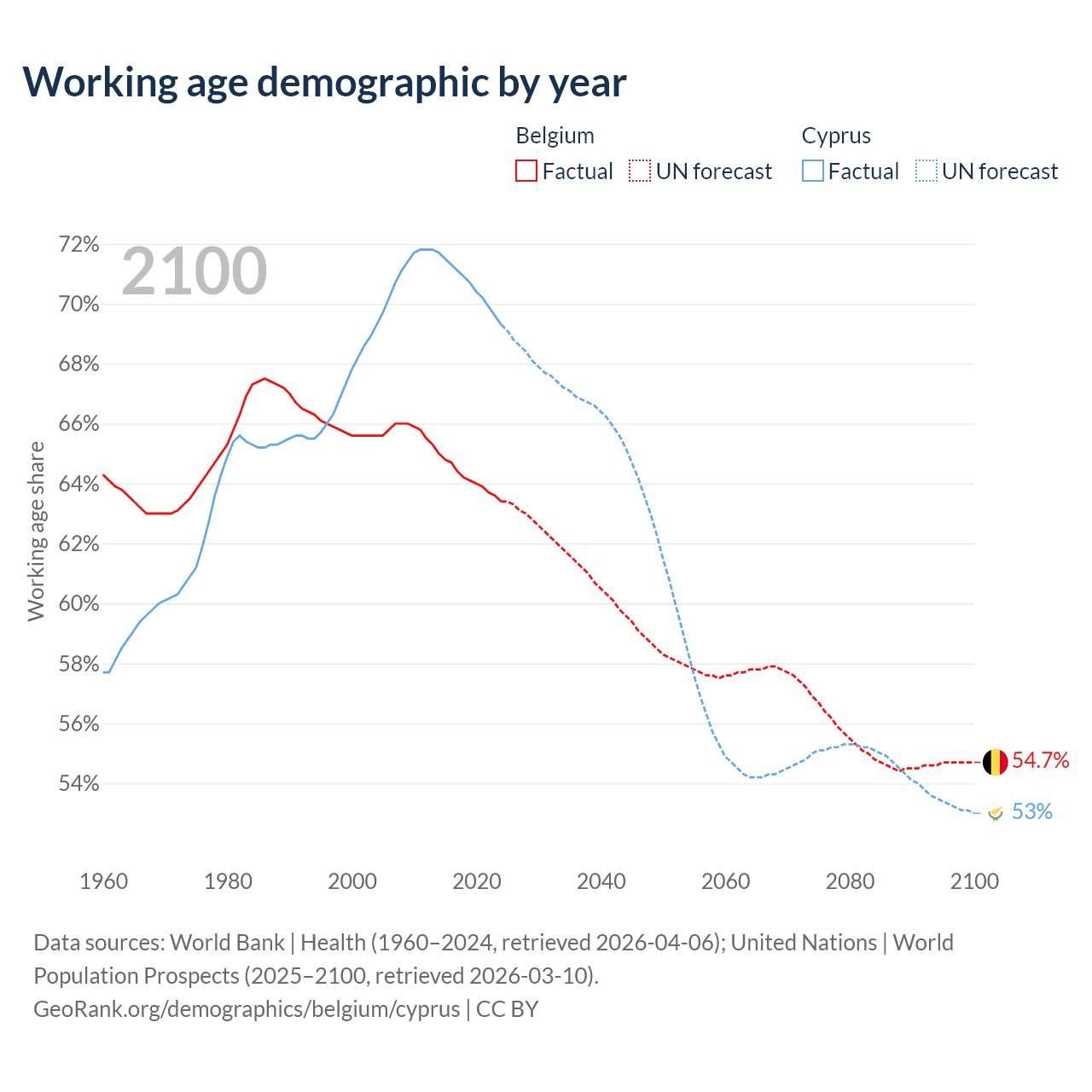 Median age Belgium vs Cyprus, 1960-2100