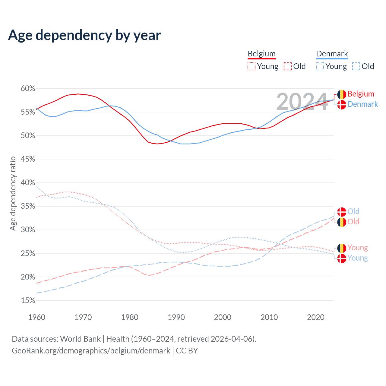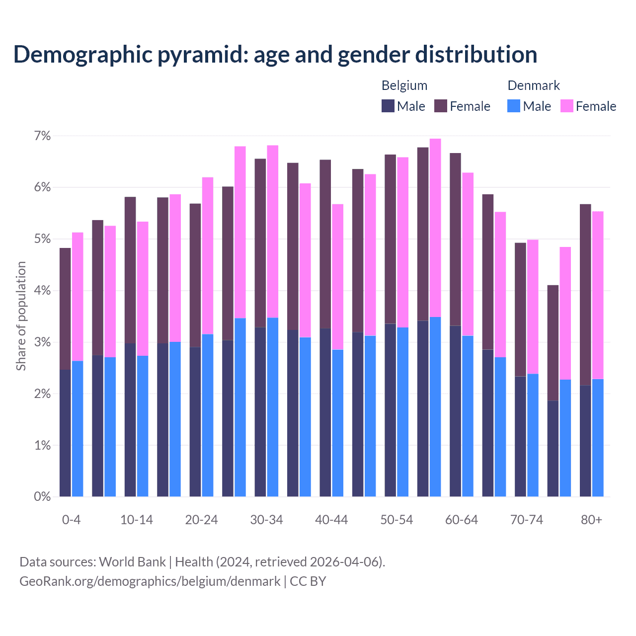 - Belgium is ranked 32/196 by median age (oldest to youngest) vs 34/196 for Denmark.