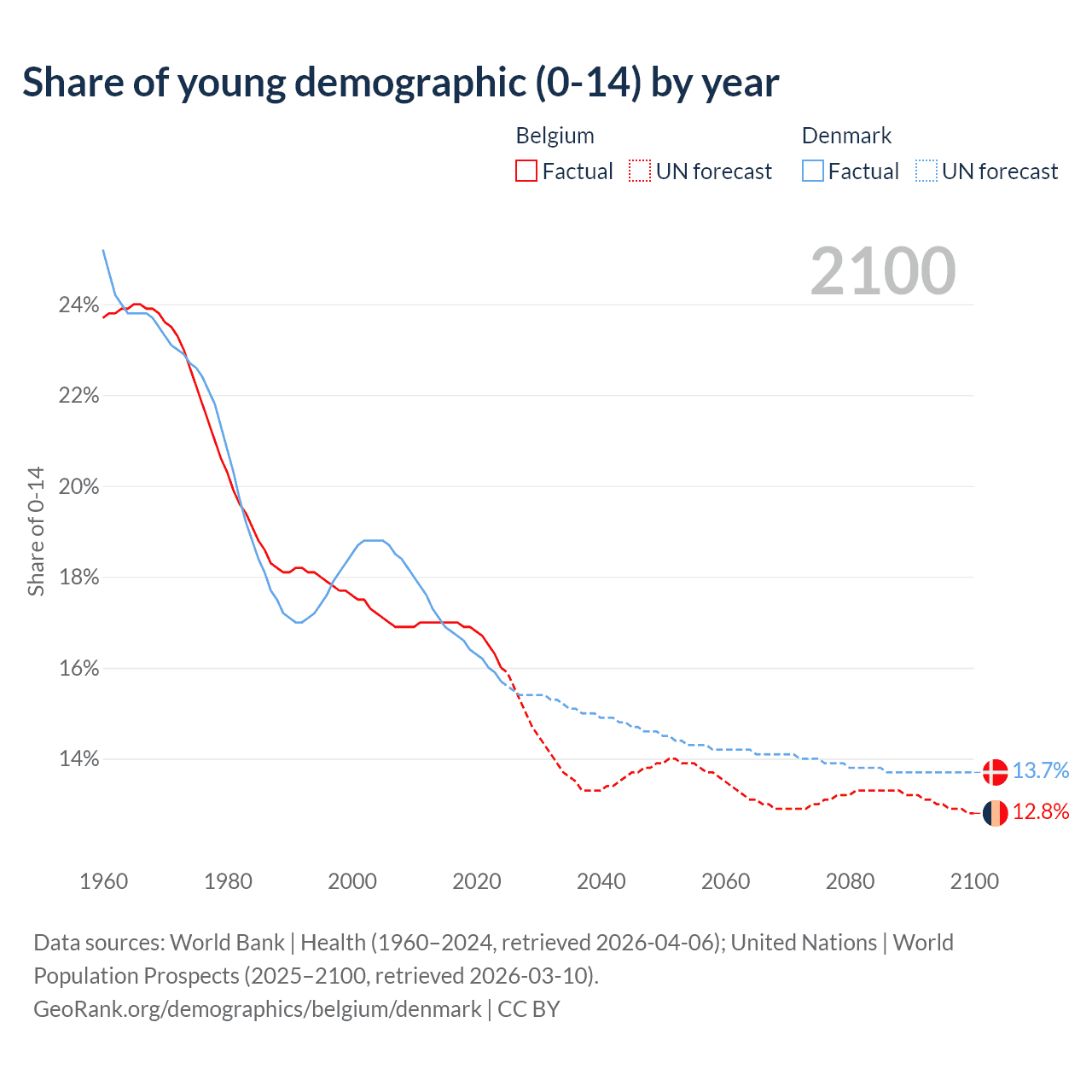 - The share of young demographic (0-15 years old) in Belgium is 16% vs 15.7% in Denmark.