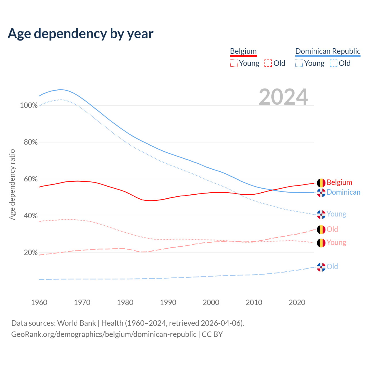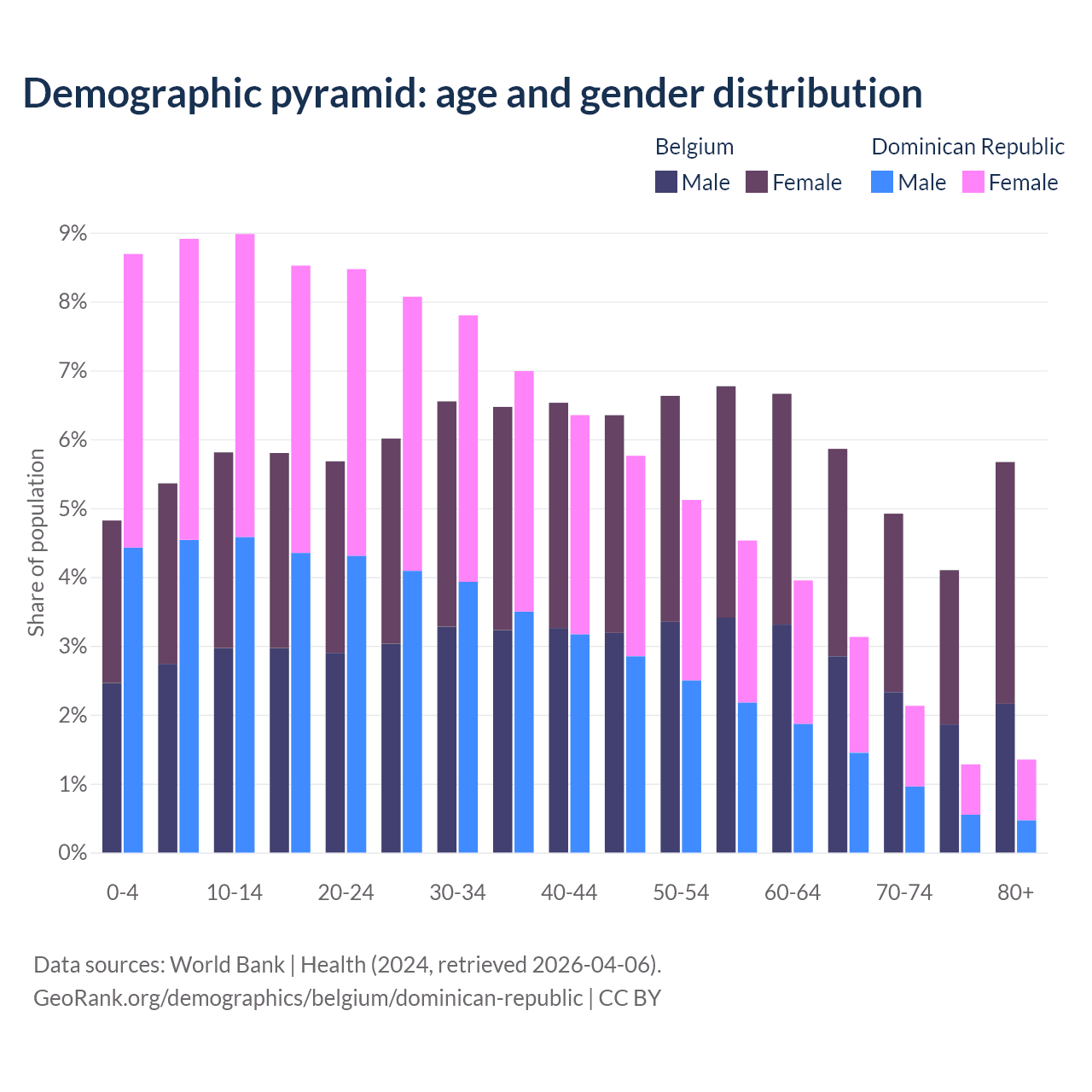 - Belgium is ranked 32/196 by median age (oldest to youngest) vs 112/196 for the Dominican Republic.