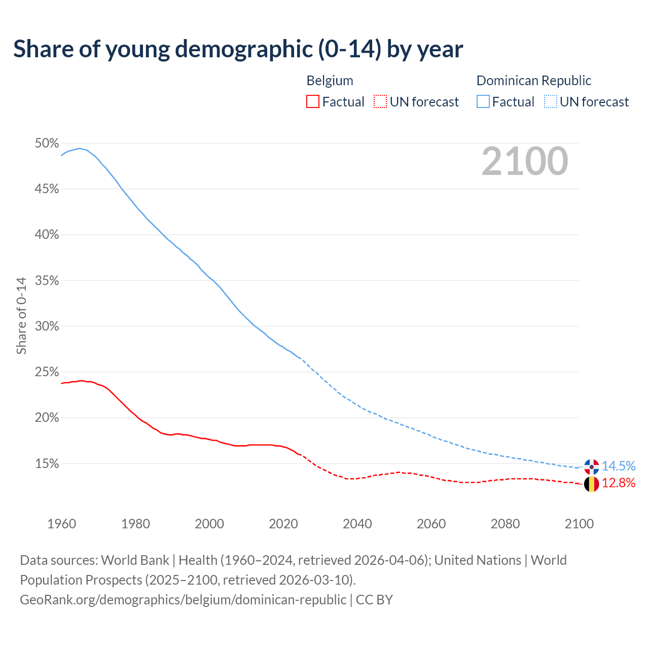 - The share of young demographic (0-15 years old) in Belgium is 16% vs 26.6% in the Dominican Republic.