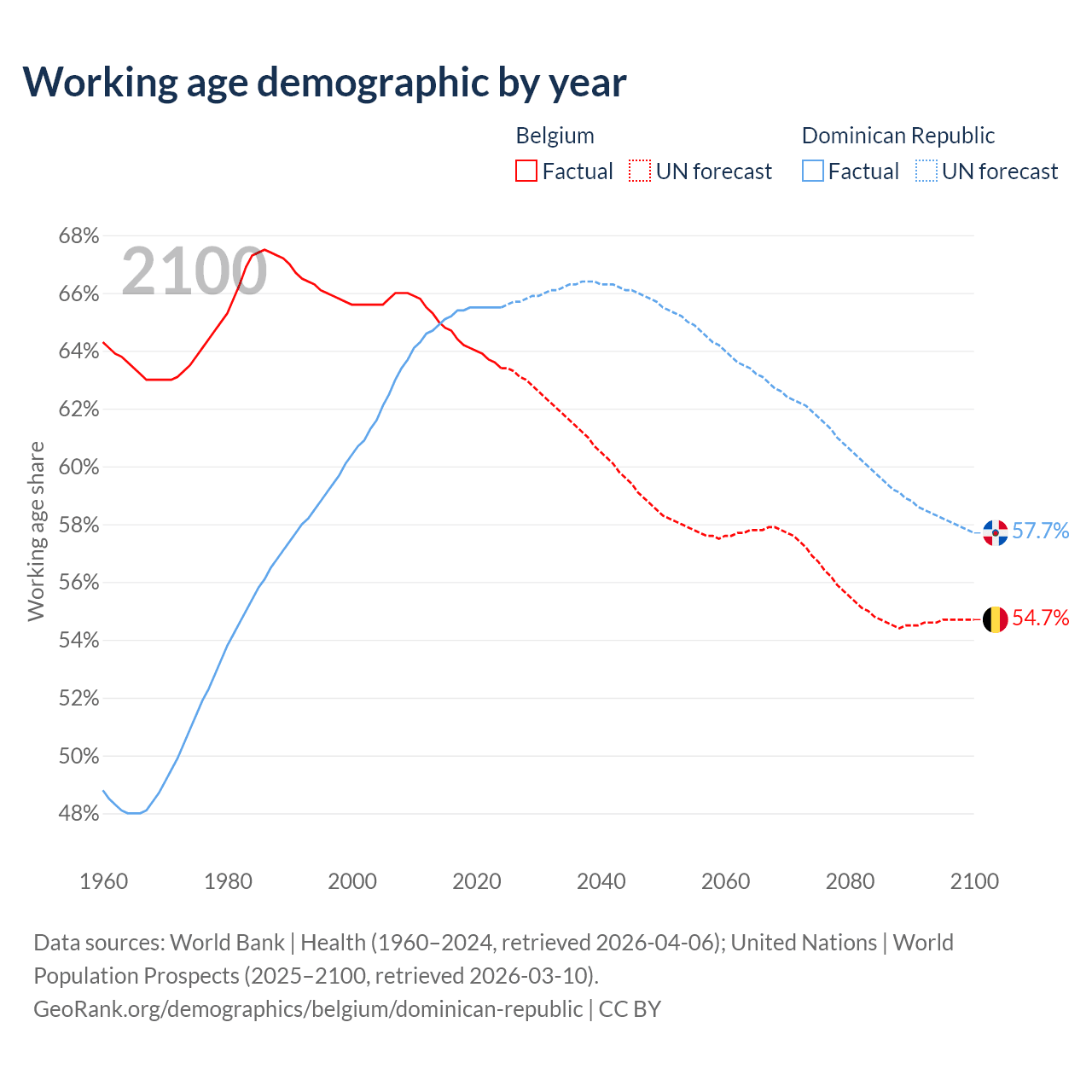 - Belgium has 7.55M working age adults (aged 15-64) vs 7.63M in the Dominican Republic.