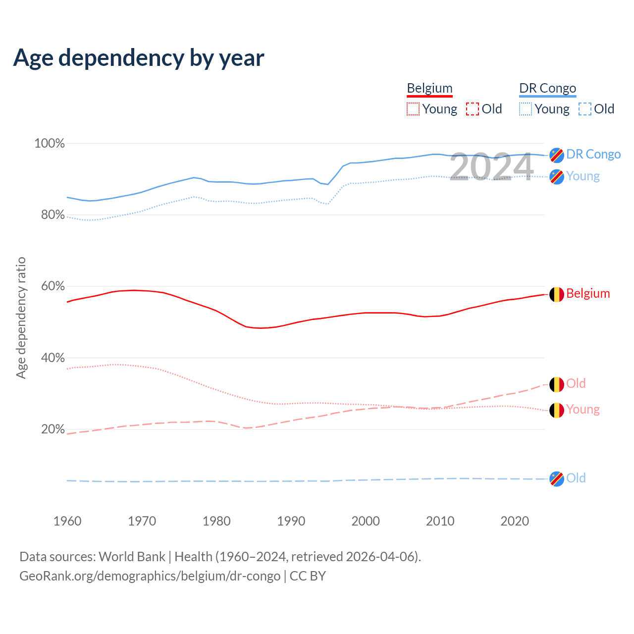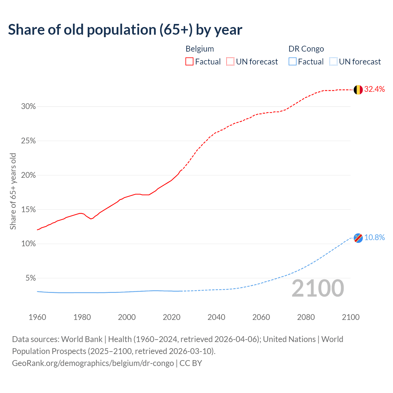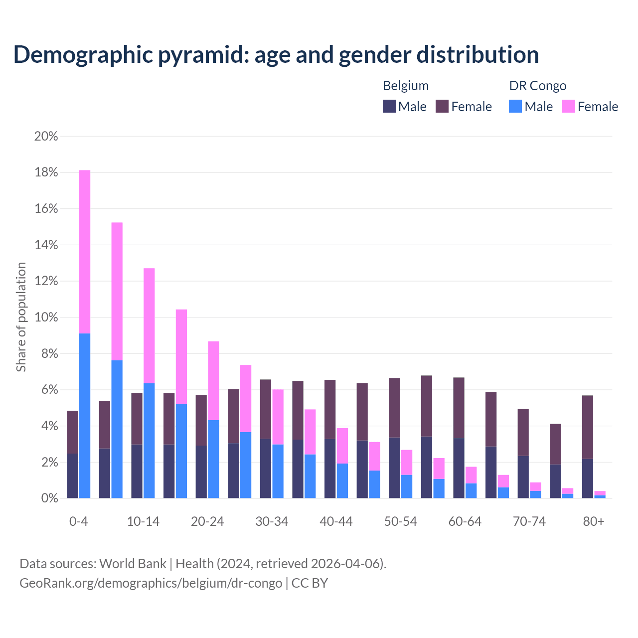 - The share of old-age demographic (65+) in Belgium is 20.6% vs 3.08% in the DR Congo.