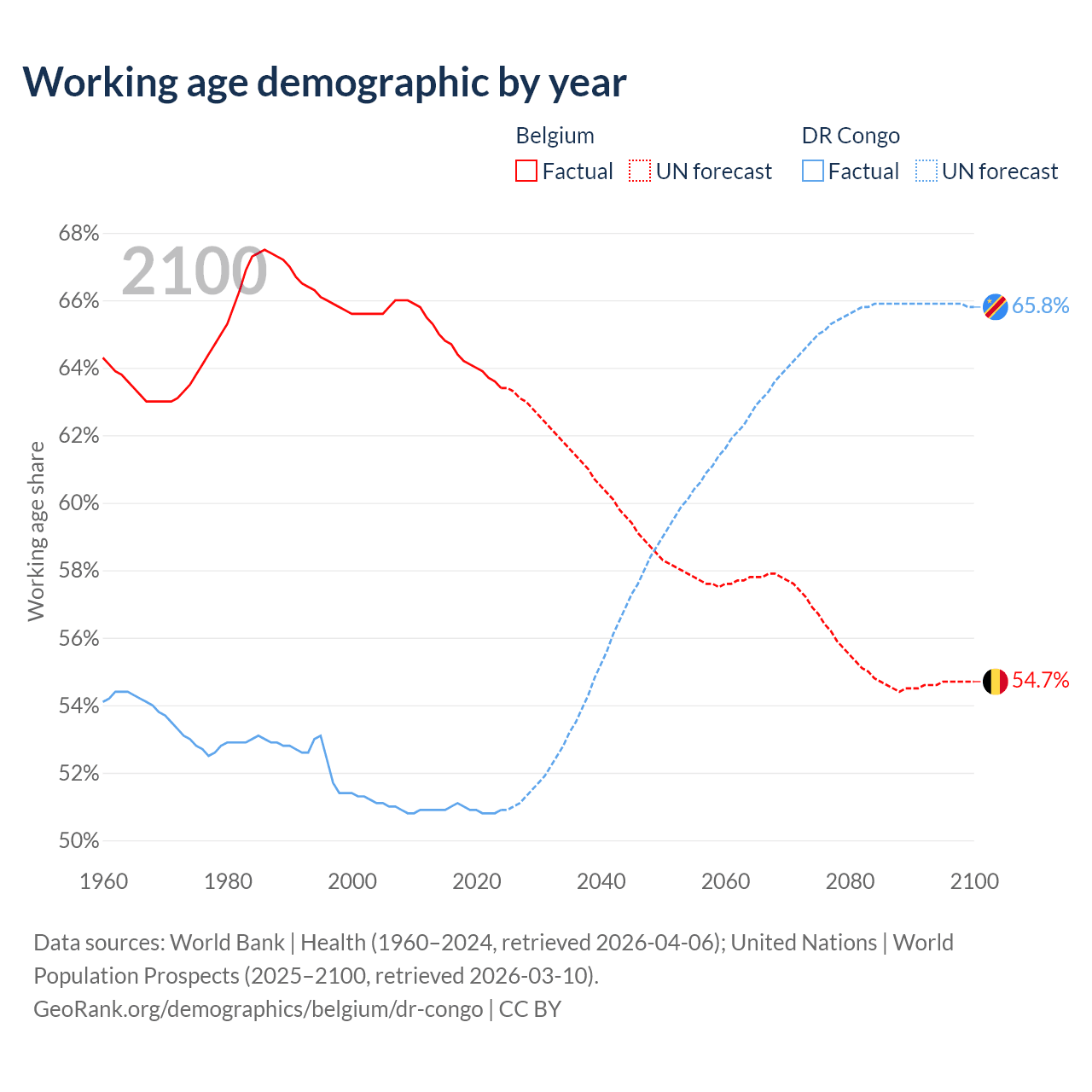 - Belgium has 7.55M working age adults (aged 15-64) vs 59.8M in the DR Congo.