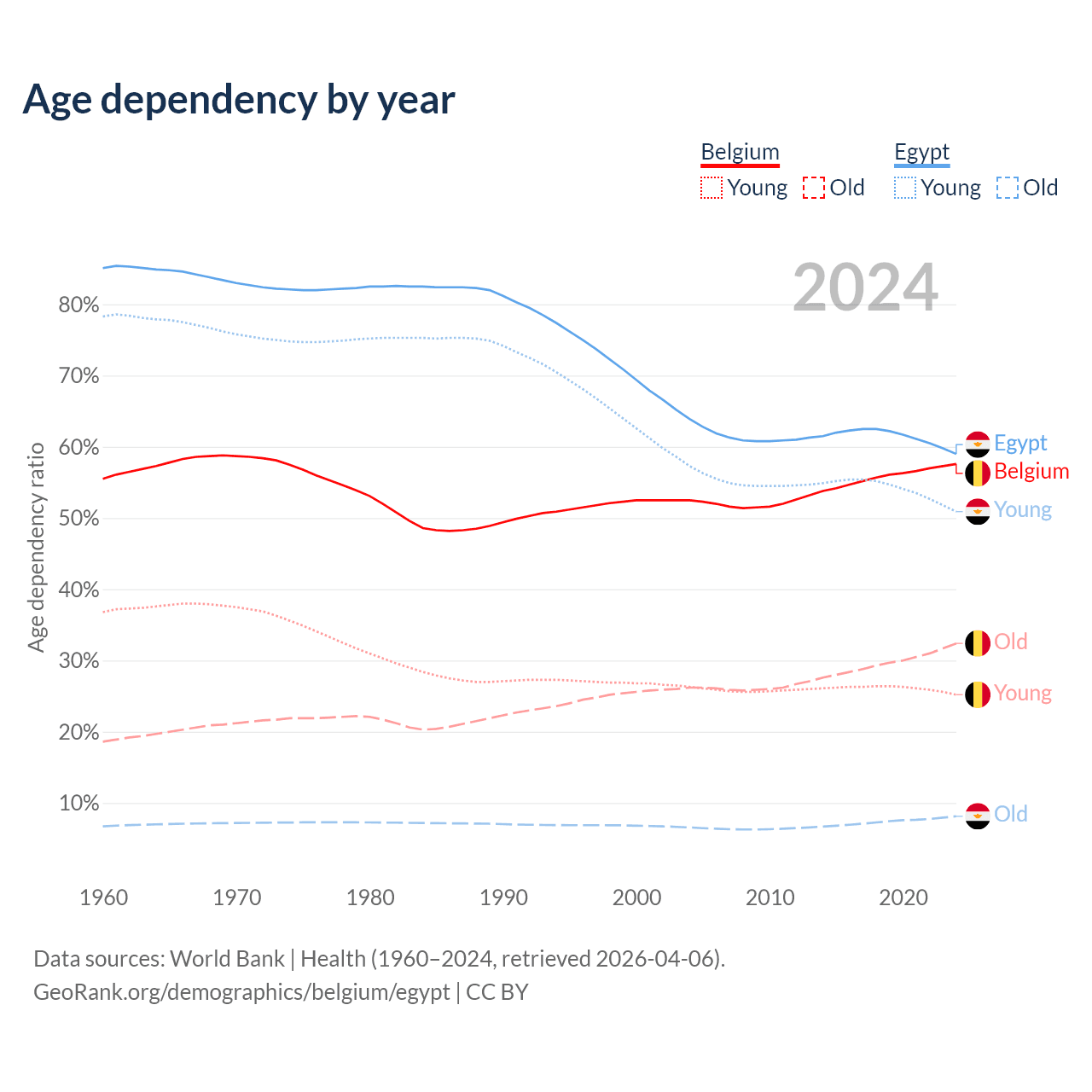 - Belgium is ranked 32/196 by median age (oldest to youngest) vs 133/196 for Egypt.