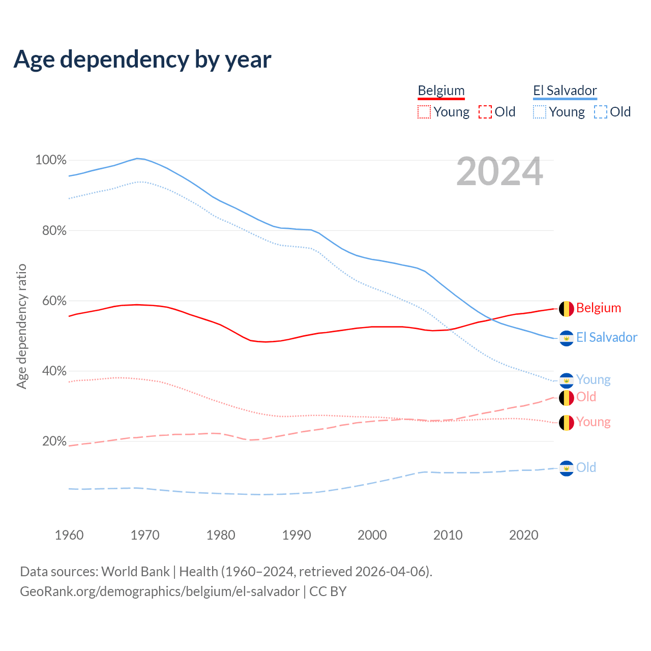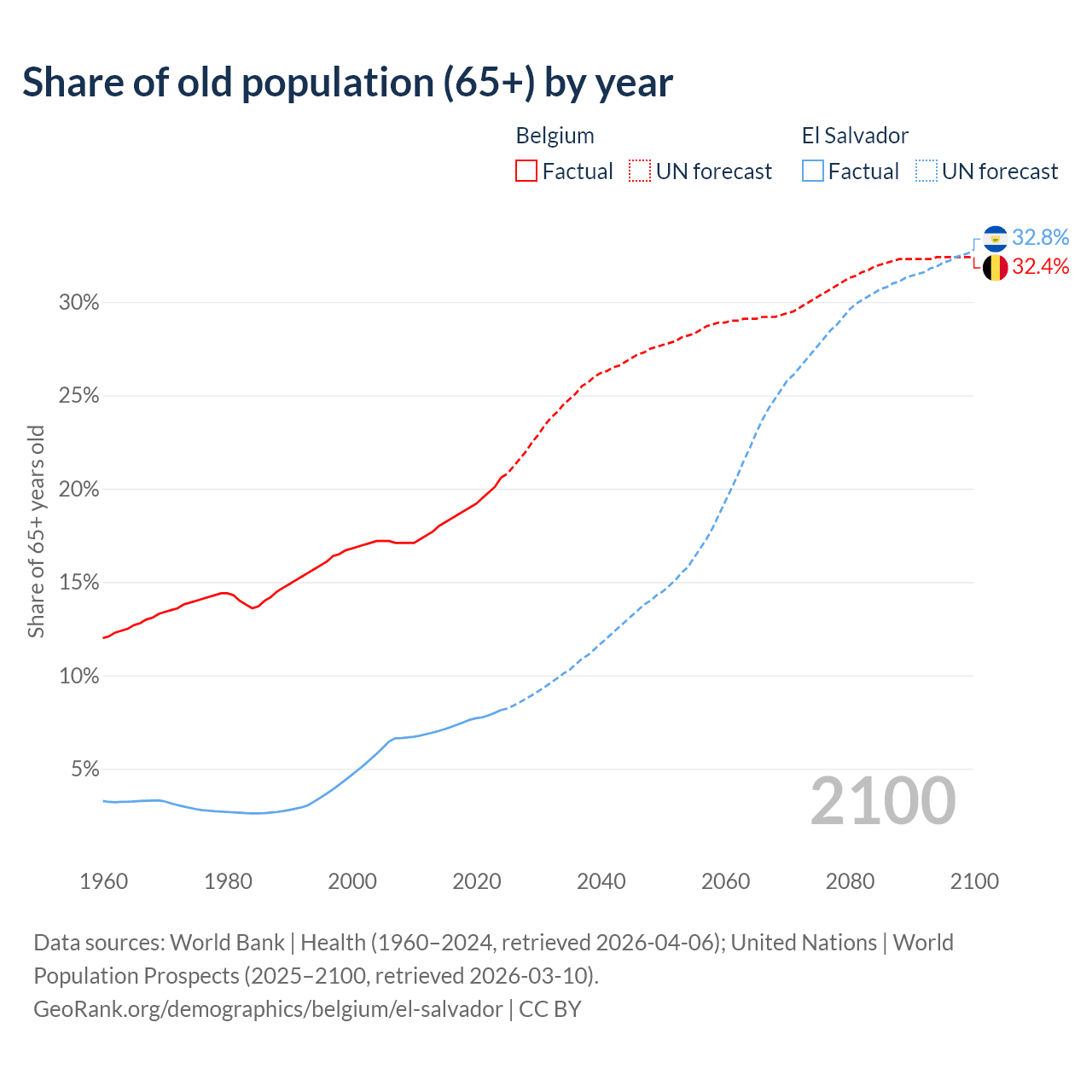 - The share of old-age demographic (65+) in Belgium is 20.6% vs 8.15% in El Salvador.