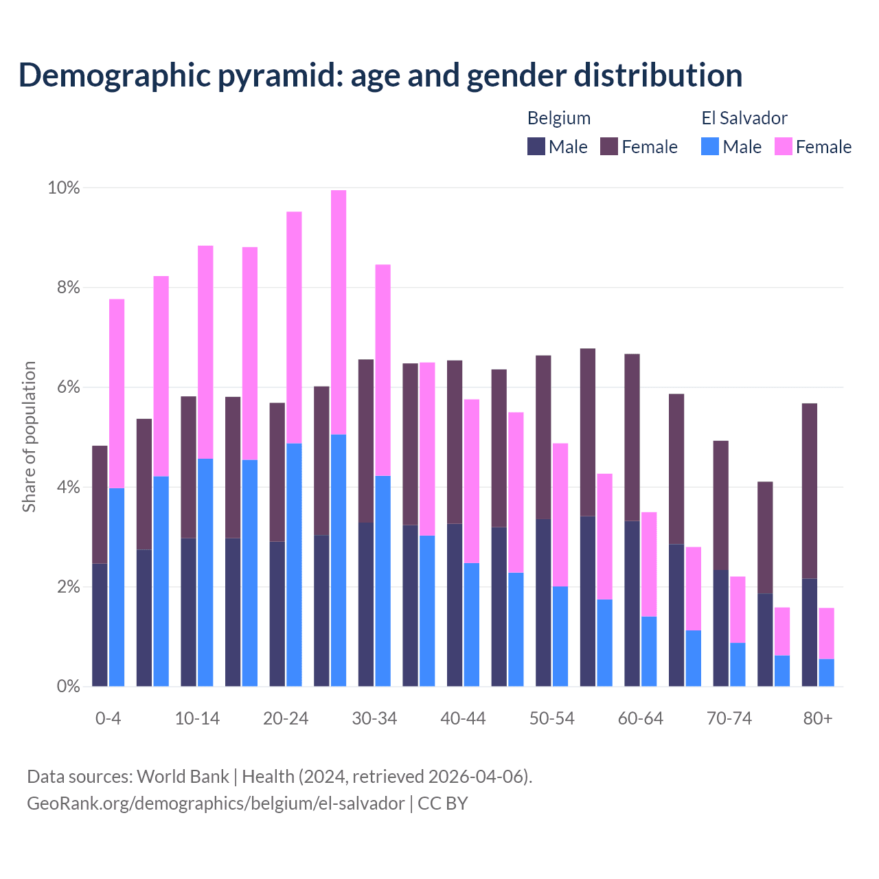 - As of 2026, the population of Belgium is 11.9M vs 6.4M in El Salvador - 1.86 times difference.