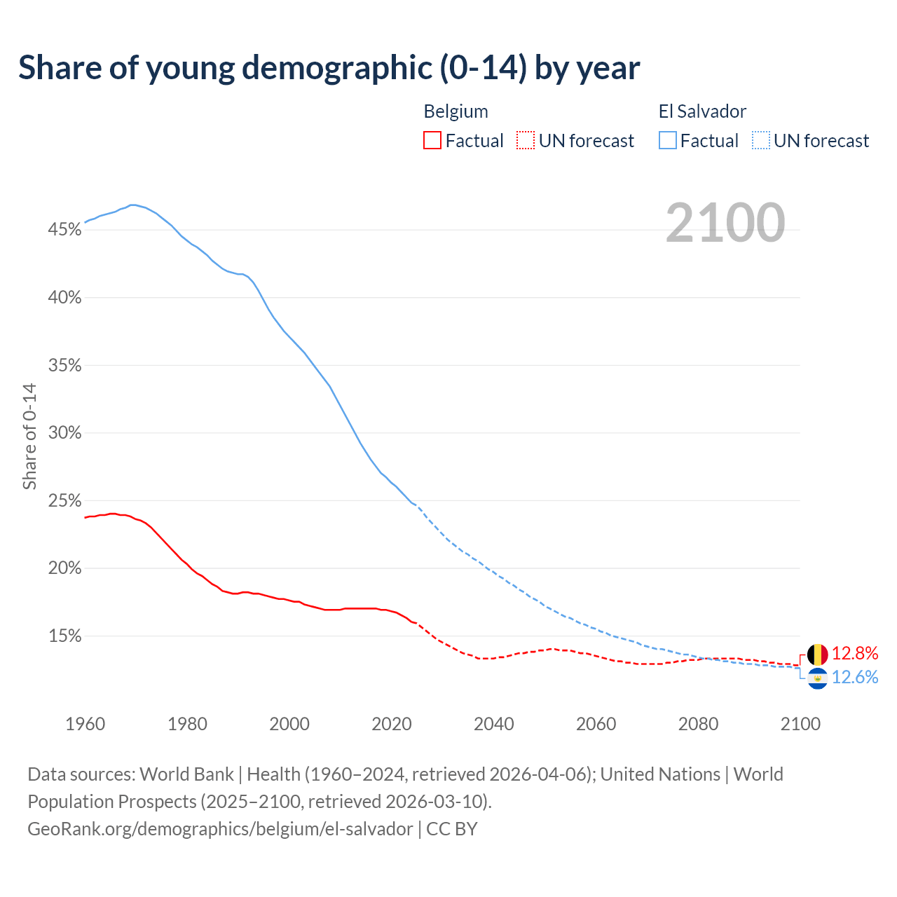 - The share of young demographic (0-15 years old) in Belgium is 16% vs 24.8% in El Salvador.