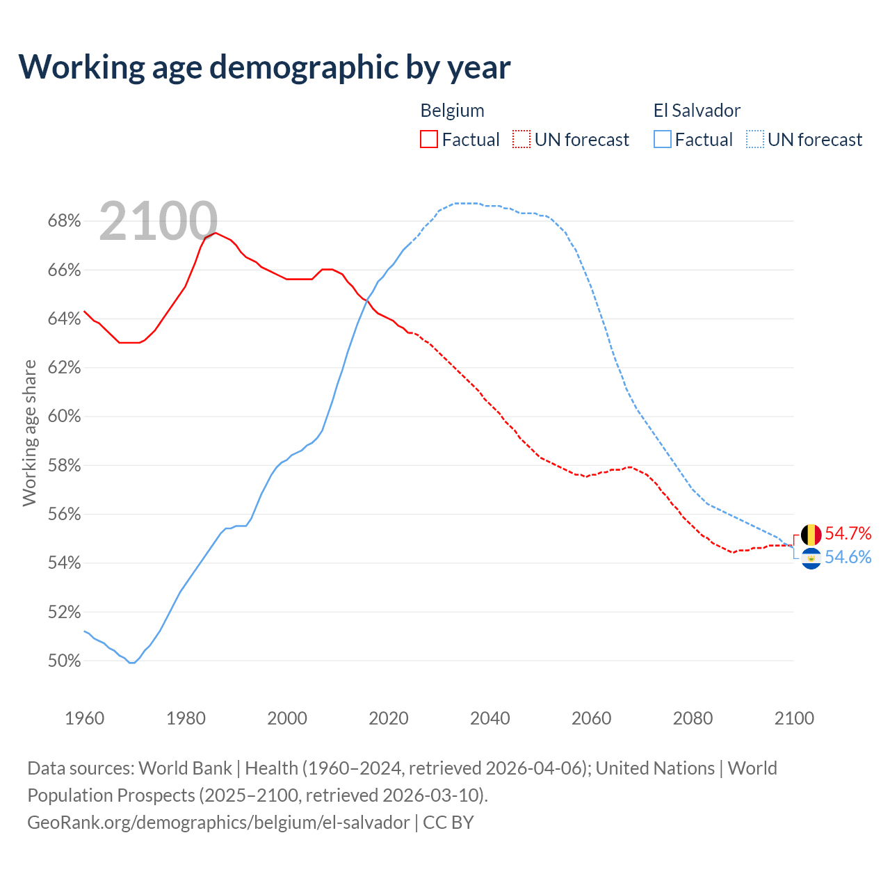 - Belgium has 7.55M working age adults (aged 15-64) vs 4.29M in El Salvador.