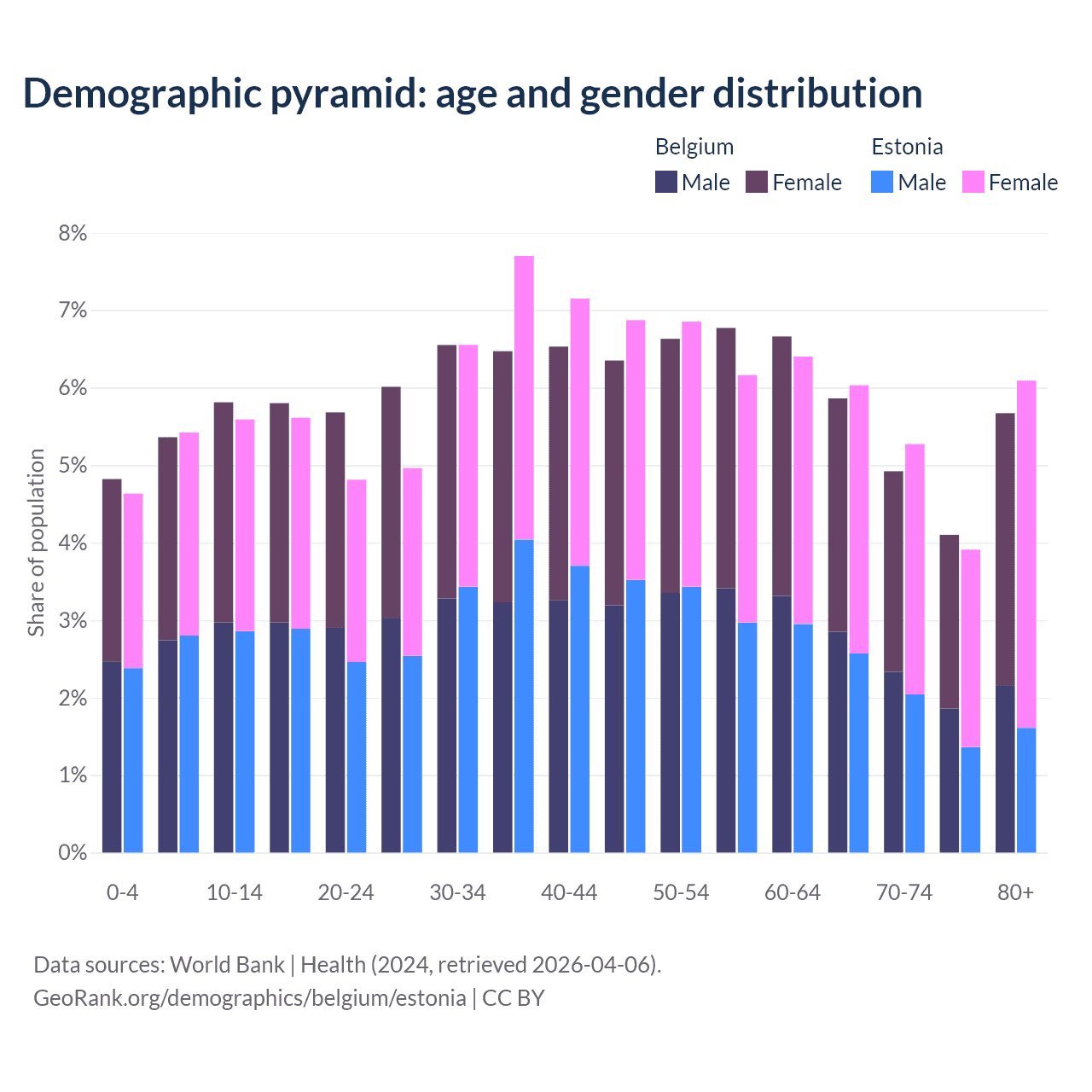 - Belgium is ranked 32/196 by median age (oldest to youngest) vs 25/196 for Estonia.