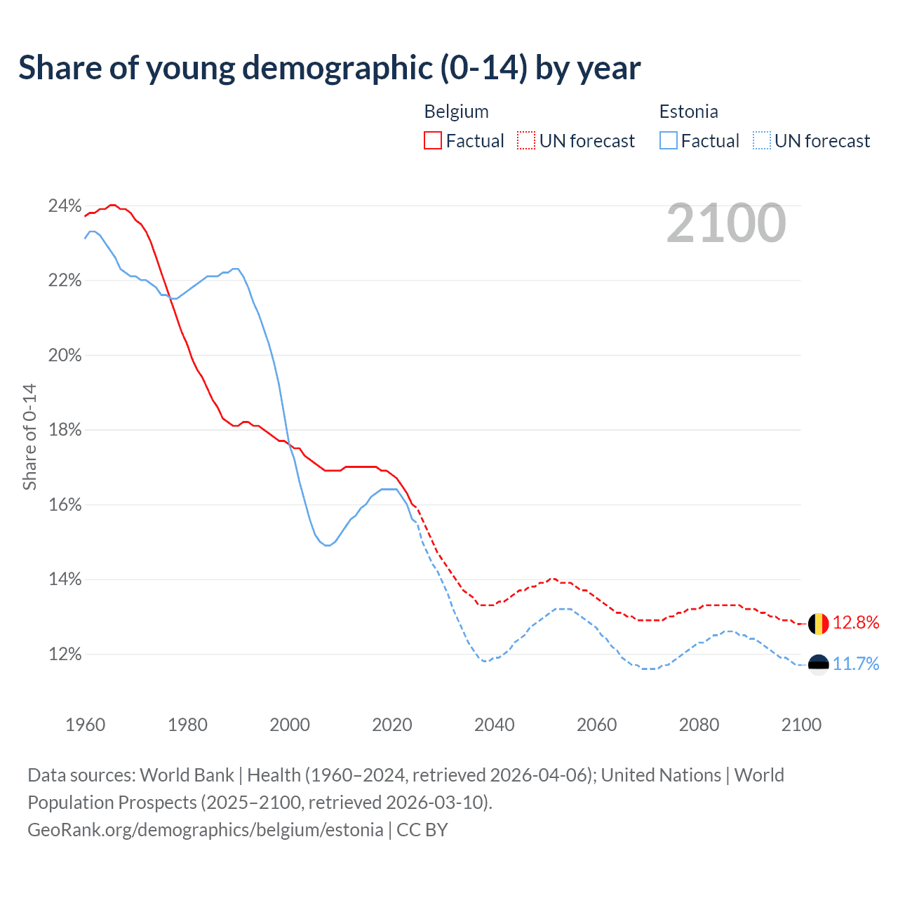 - The share of young demographic (0-15 years old) in Belgium is 16% vs 15.6% in Estonia.