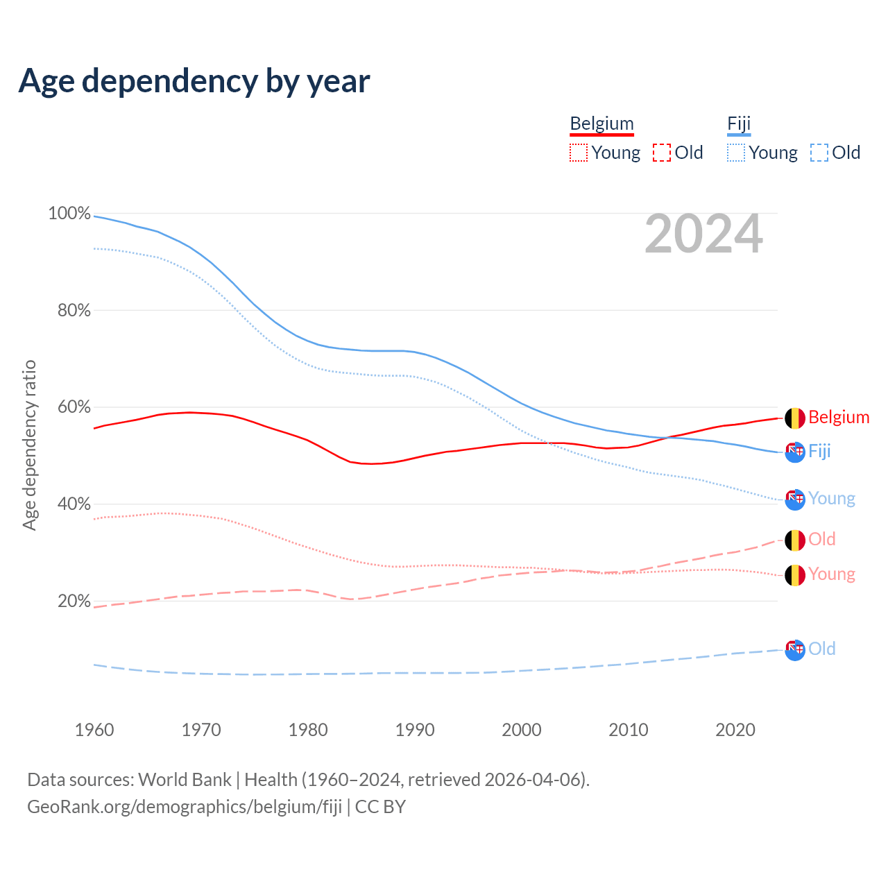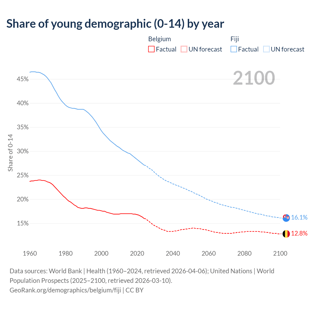 - The share of young demographic (0-15 years old) in Belgium is 16% vs 27.1% in Fiji.