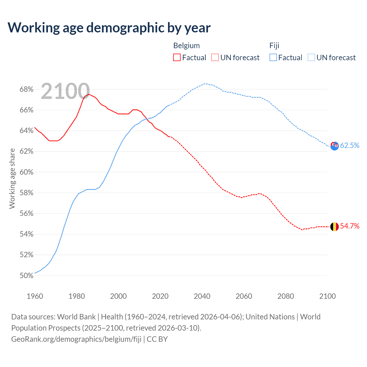 Median age Belgium vs Fiji, 1960-2100
