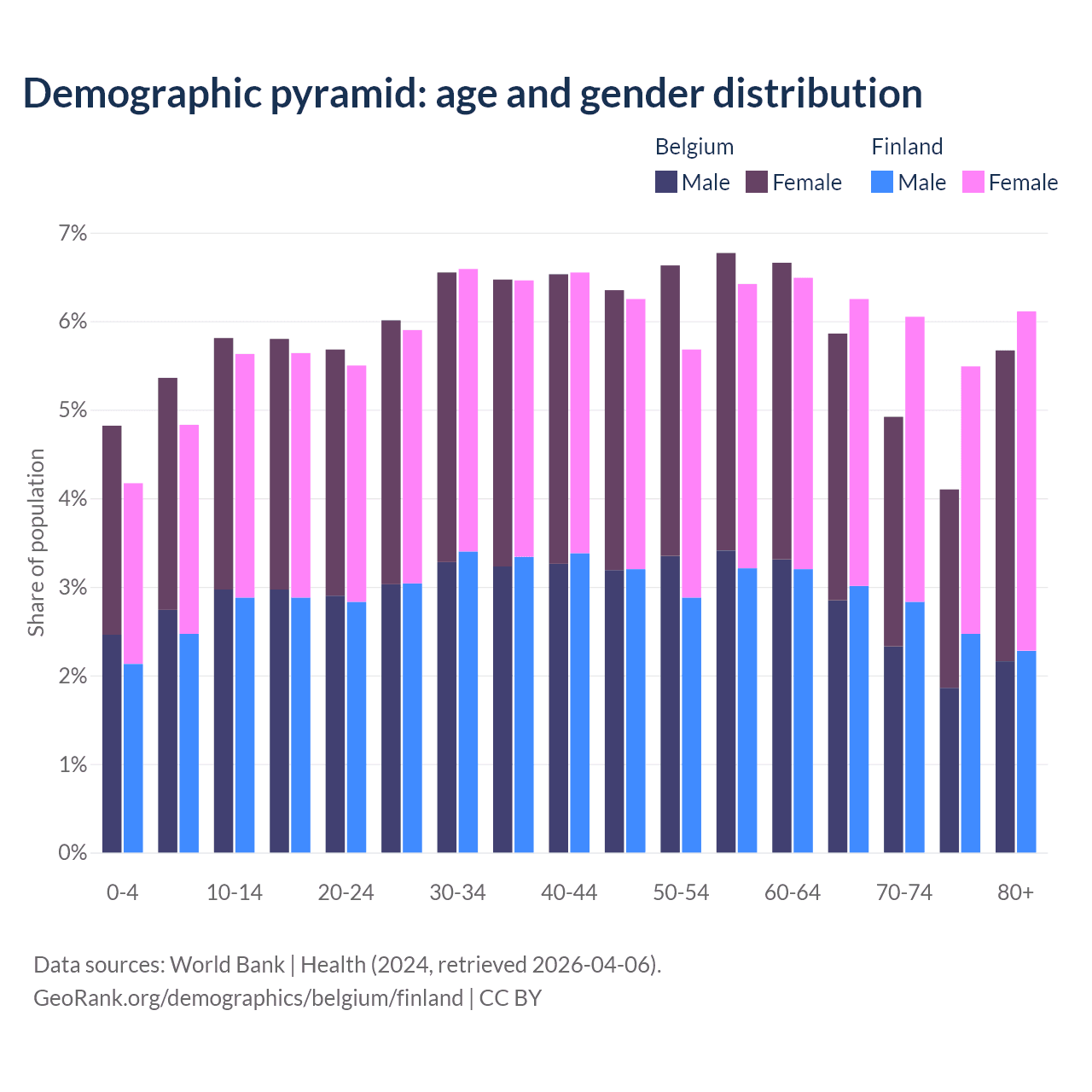 - Belgium is ranked 32/196 by median age (oldest to youngest) vs 22/196 for Finland.