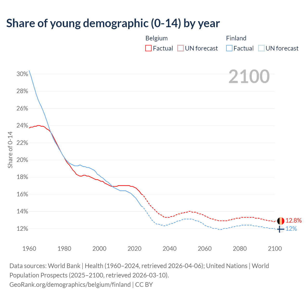 - The share of young demographic (0-15 years old) in Belgium is 16% vs 14.6% in Finland.
