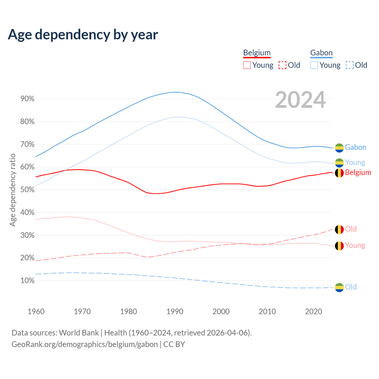 - The share of old-age demographic (65+) in Belgium is 20.6% vs 4.08% in Gabon.