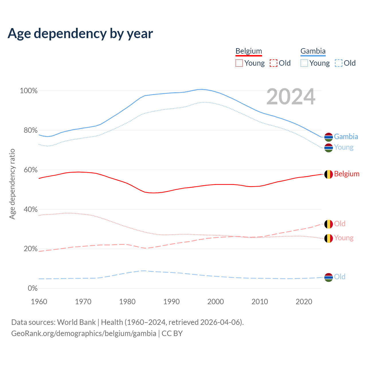 - The share of old-age demographic (65+) in Belgium is 20.6% vs 3.08% in the Gambia.