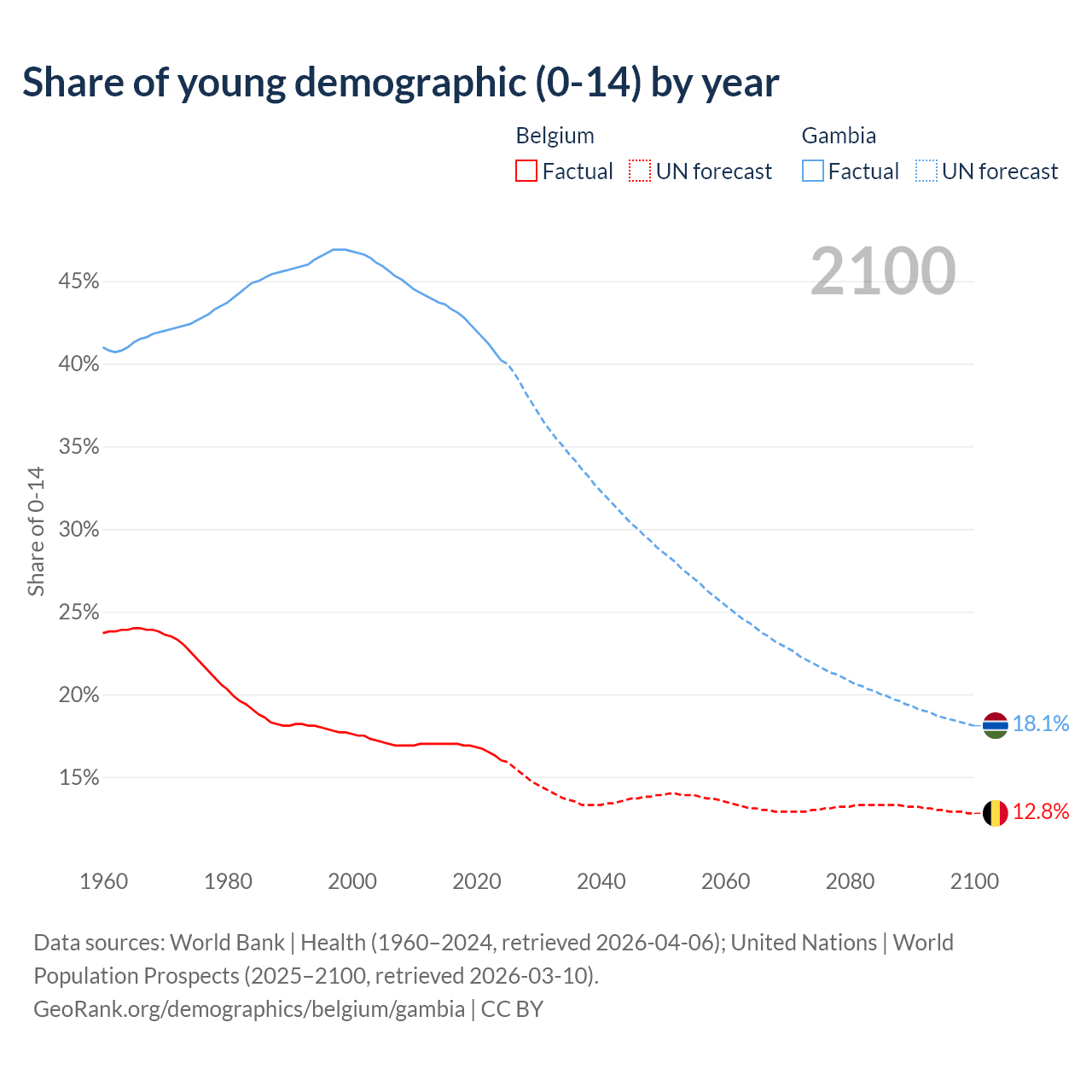 - The share of young demographic (0-15 years old) in Belgium is 16% vs 40.2% in the Gambia.