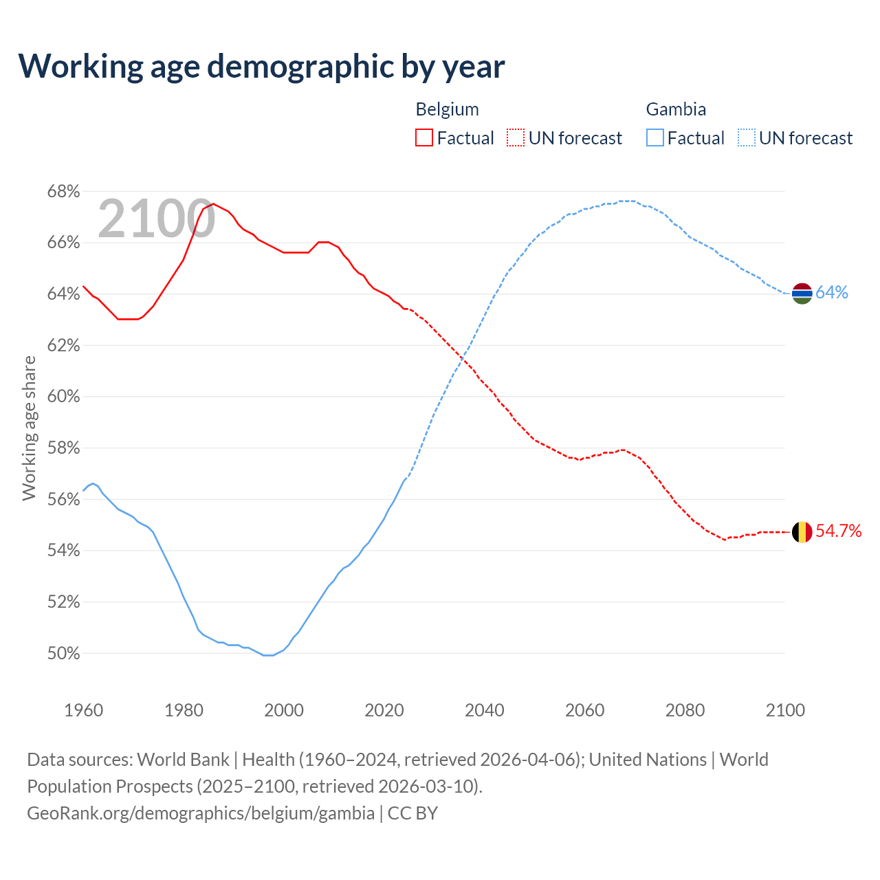 Median age Belgium vs Gambia, 1960-2100