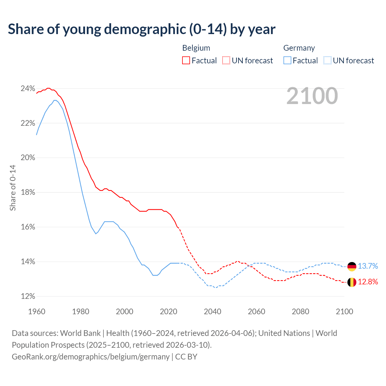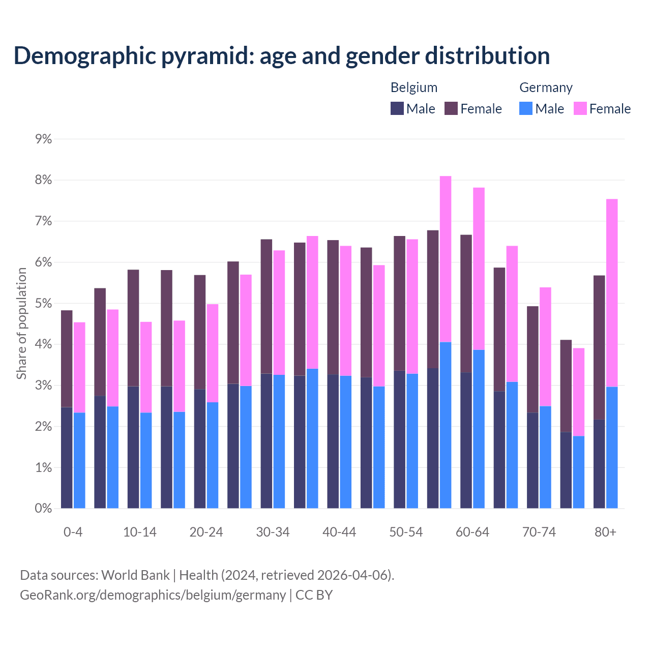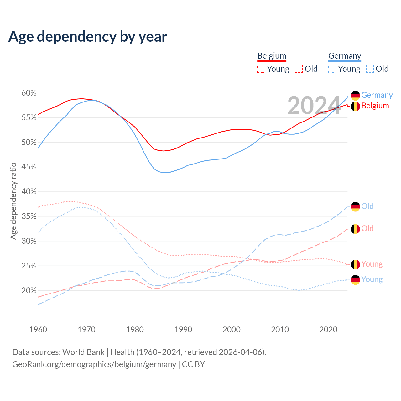 - Belgium is ranked 32/196 by median age (oldest to youngest) vs 9/196 for Germany.