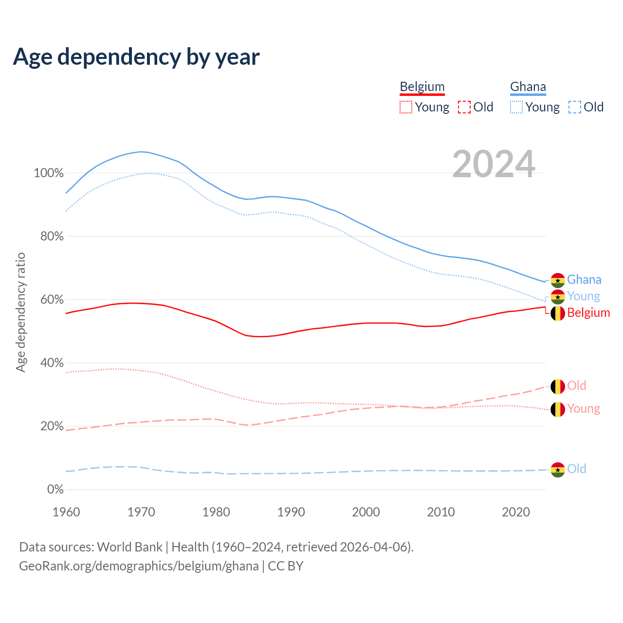 - The share of old-age demographic (65+) in Belgium is 20.6% vs 3.71% in Ghana.
