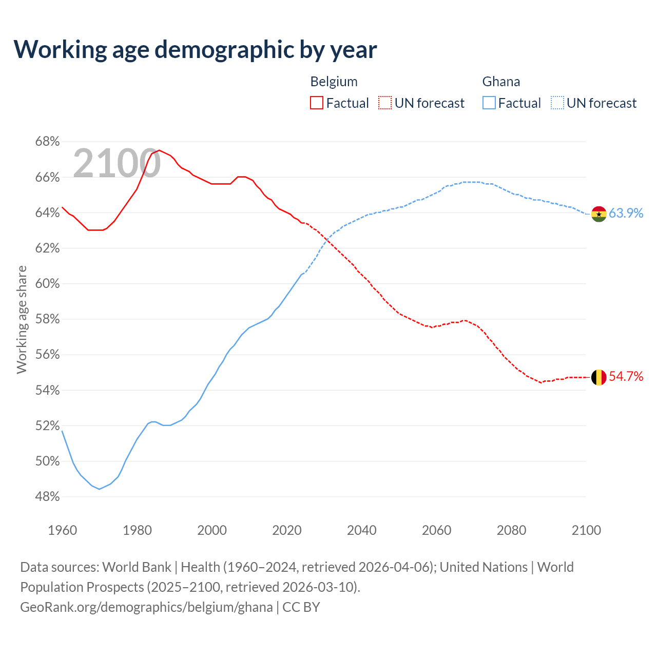 Median age Belgium vs Ghana, 1960-2100