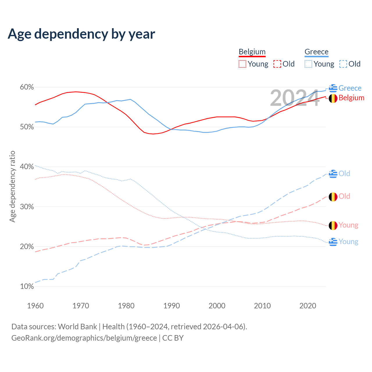 - Belgium is ranked 32/196 by median age (oldest to youngest) vs 6/196 for Greece.