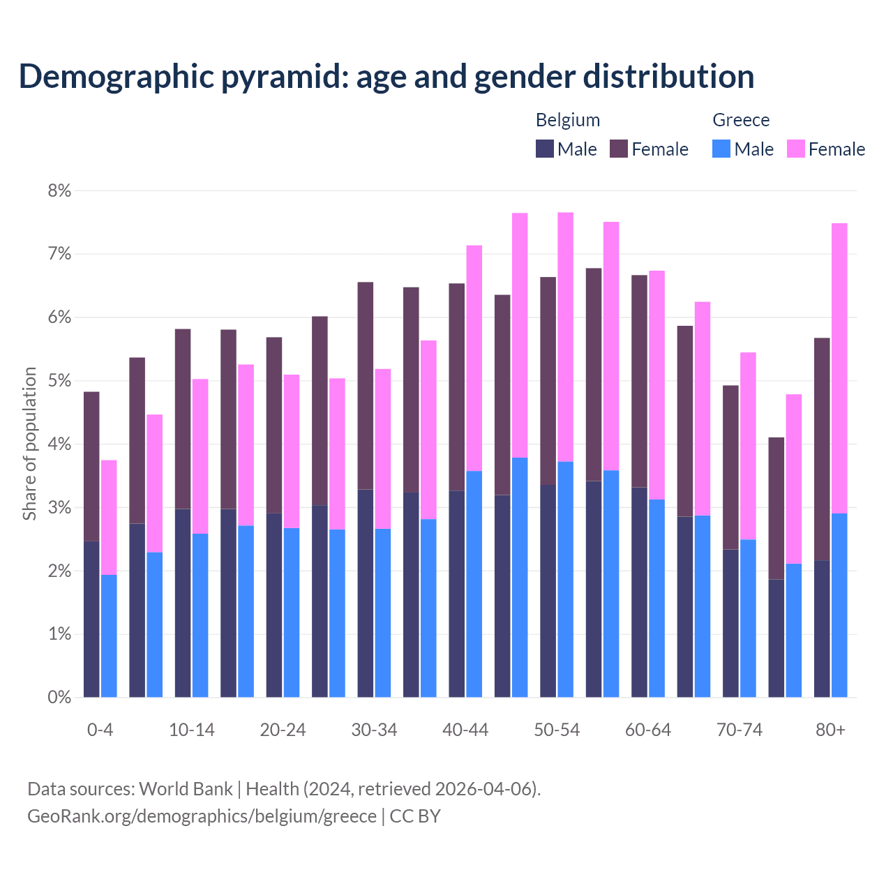 - As of 2026, the population of Belgium is 11.9M vs 10.2M in Greece.