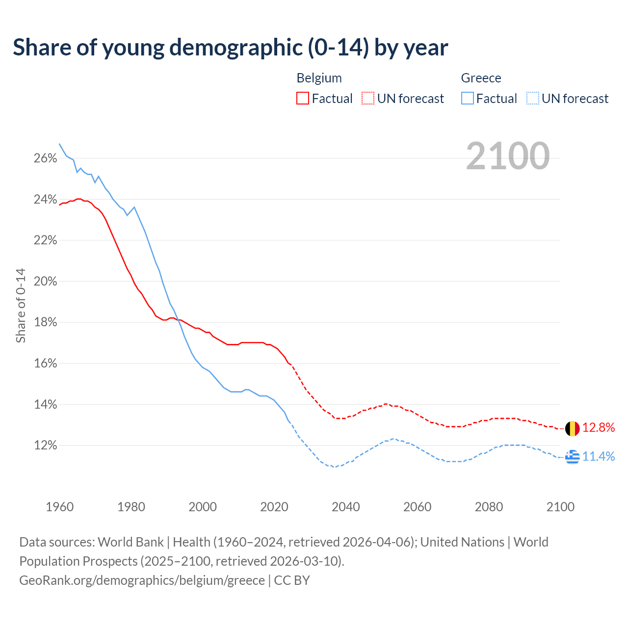 - The share of young demographic (0-15 years old) in Belgium is 16% vs 13.2% in Greece.