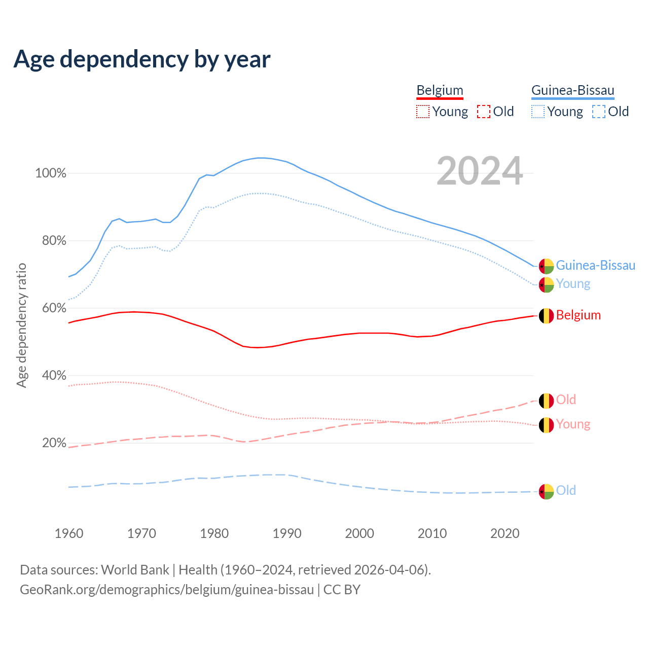 - The share of young demographic (0-15 years old) in Belgium is 16% vs 38.8% in Guinea-Bissau.