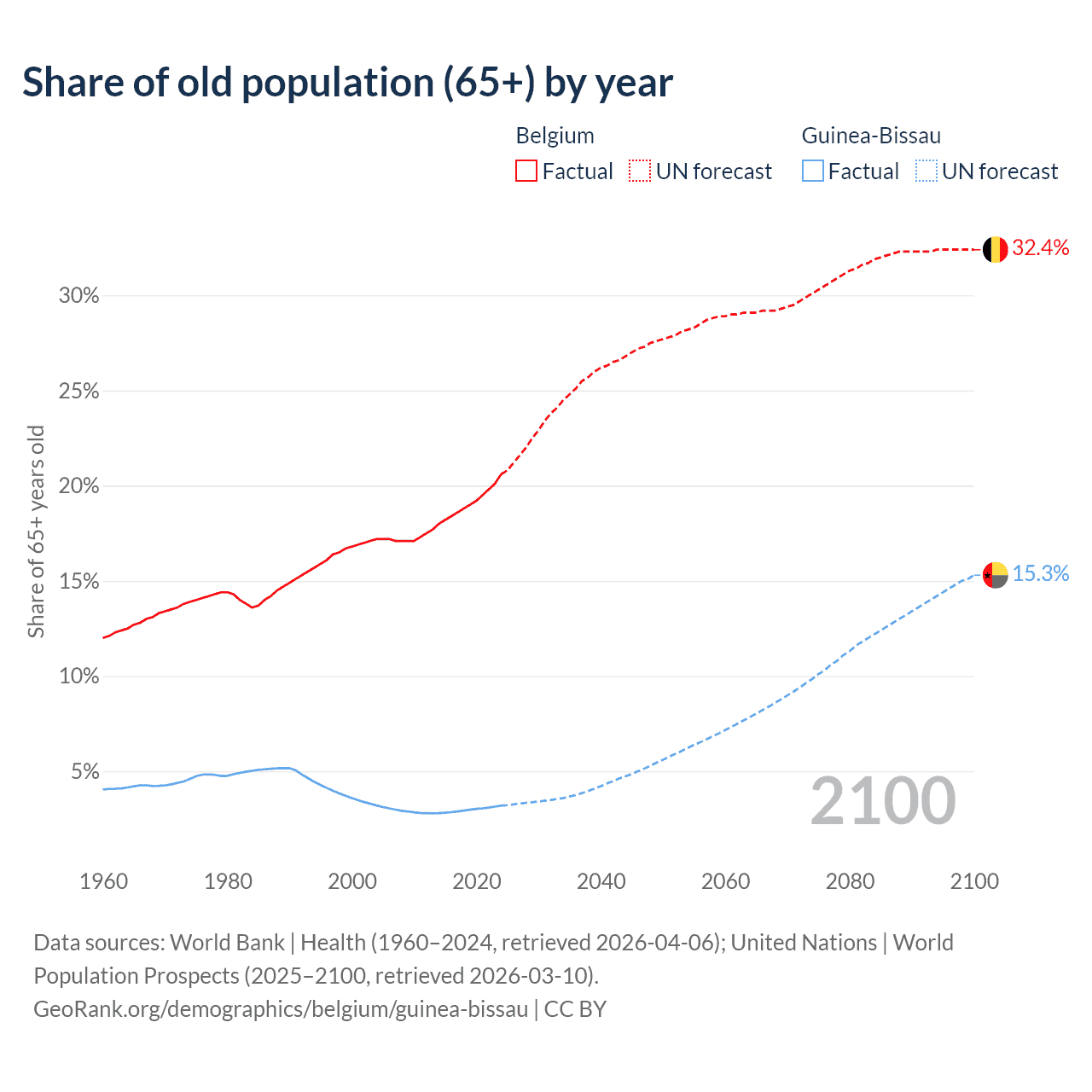 - The share of old-age demographic (65+) in Belgium is 20.6% vs 3.19% in Guinea-Bissau.