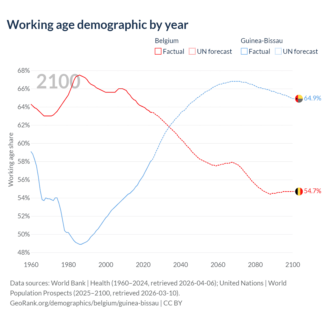Median age Belgium vs Guinea-Bissau, 1960-2100