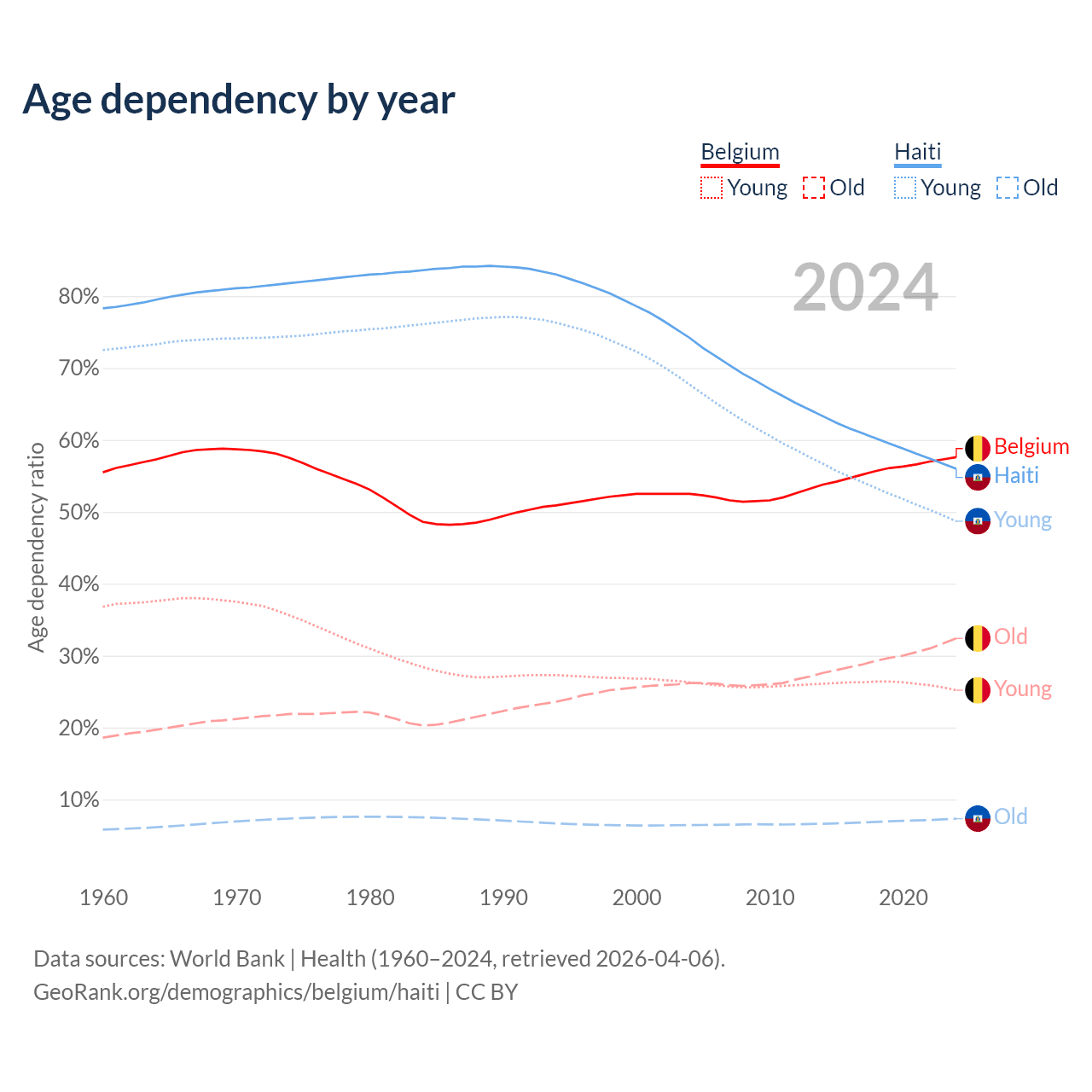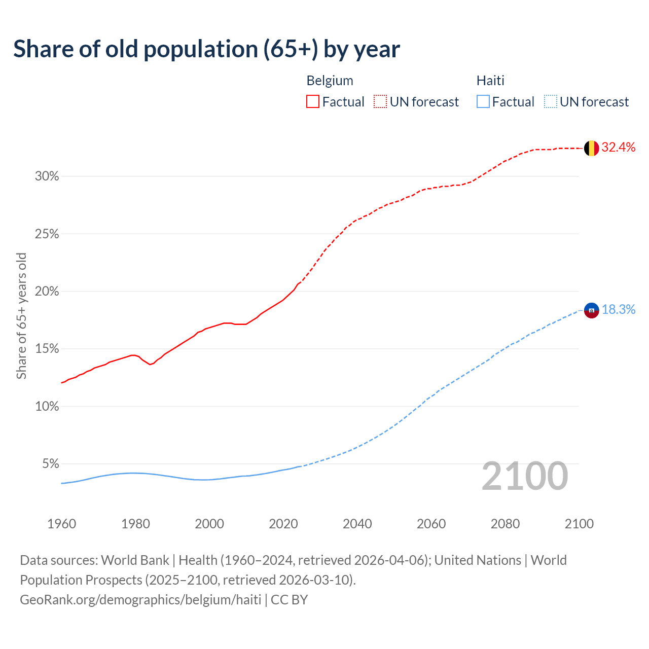 - The share of old-age demographic (65+) in Belgium is 20.6% vs 4.71% in Haiti.
