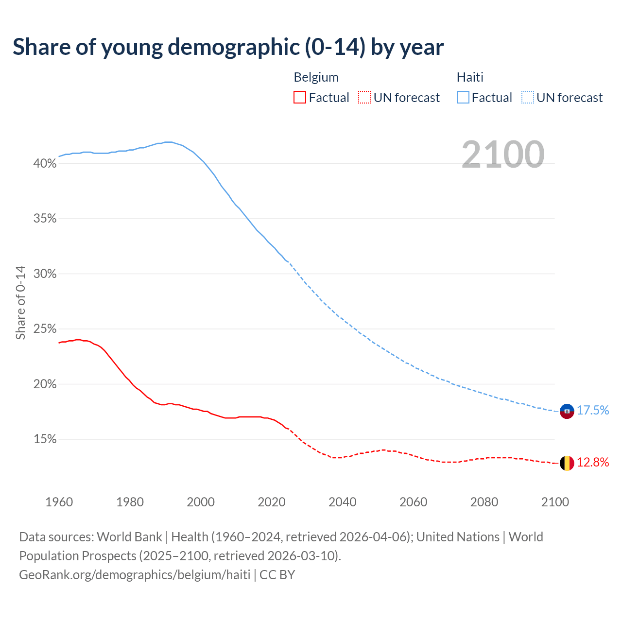 - The share of young demographic (0-15 years old) in Belgium is 16% vs 31.2% in Haiti.