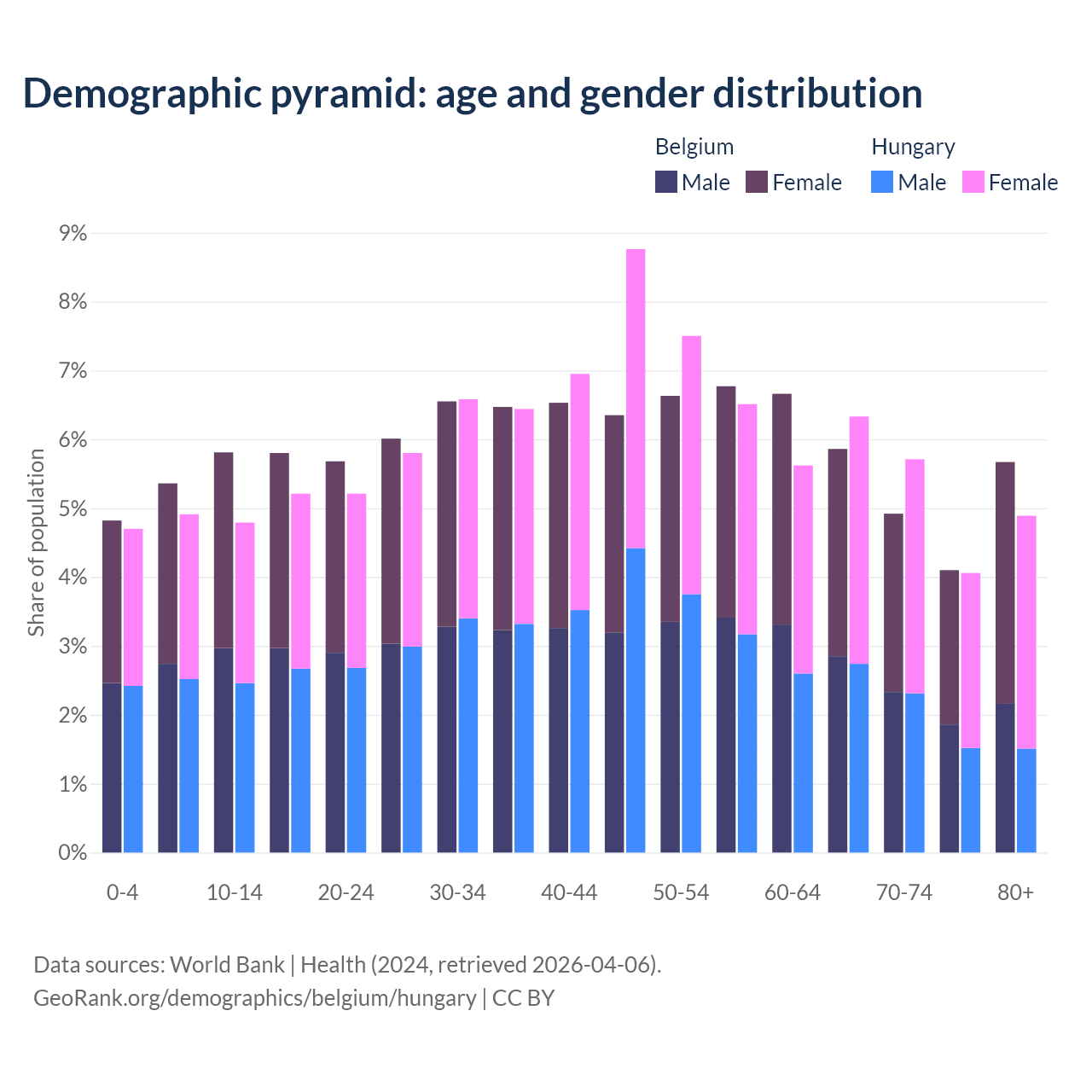 - Belgium is ranked 32/196 by median age (oldest to youngest) vs 17/196 for Hungary.