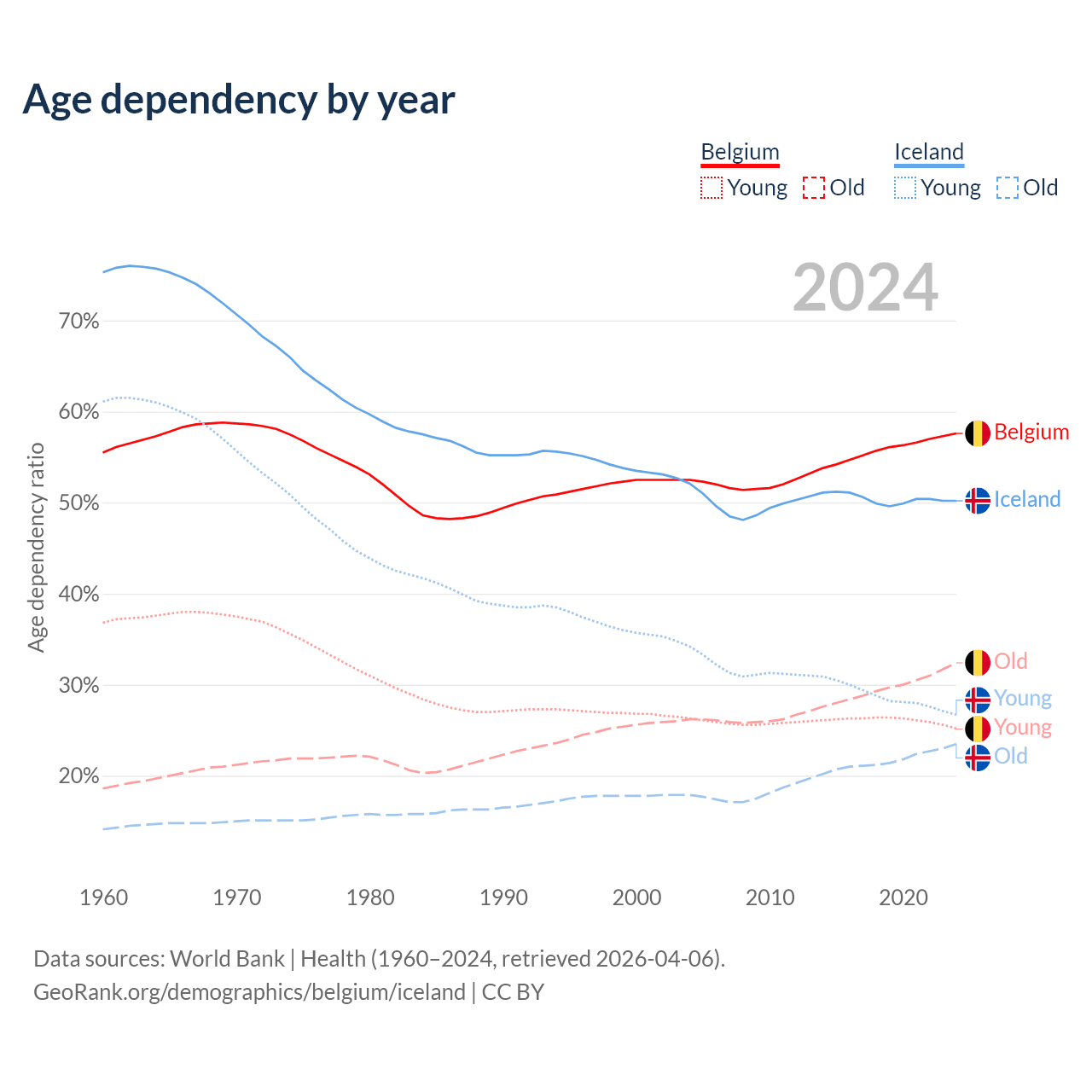- Belgium is ranked 32/196 by median age (oldest to youngest) vs 65/196 for Iceland.